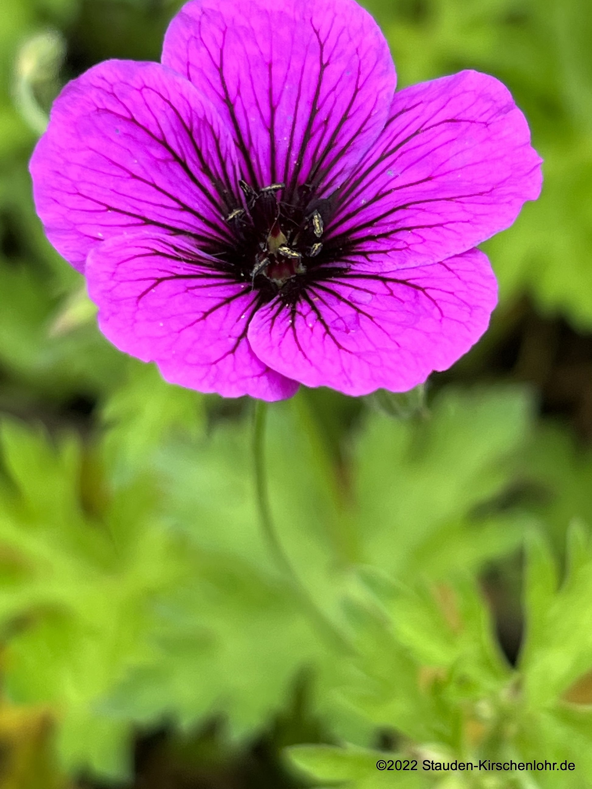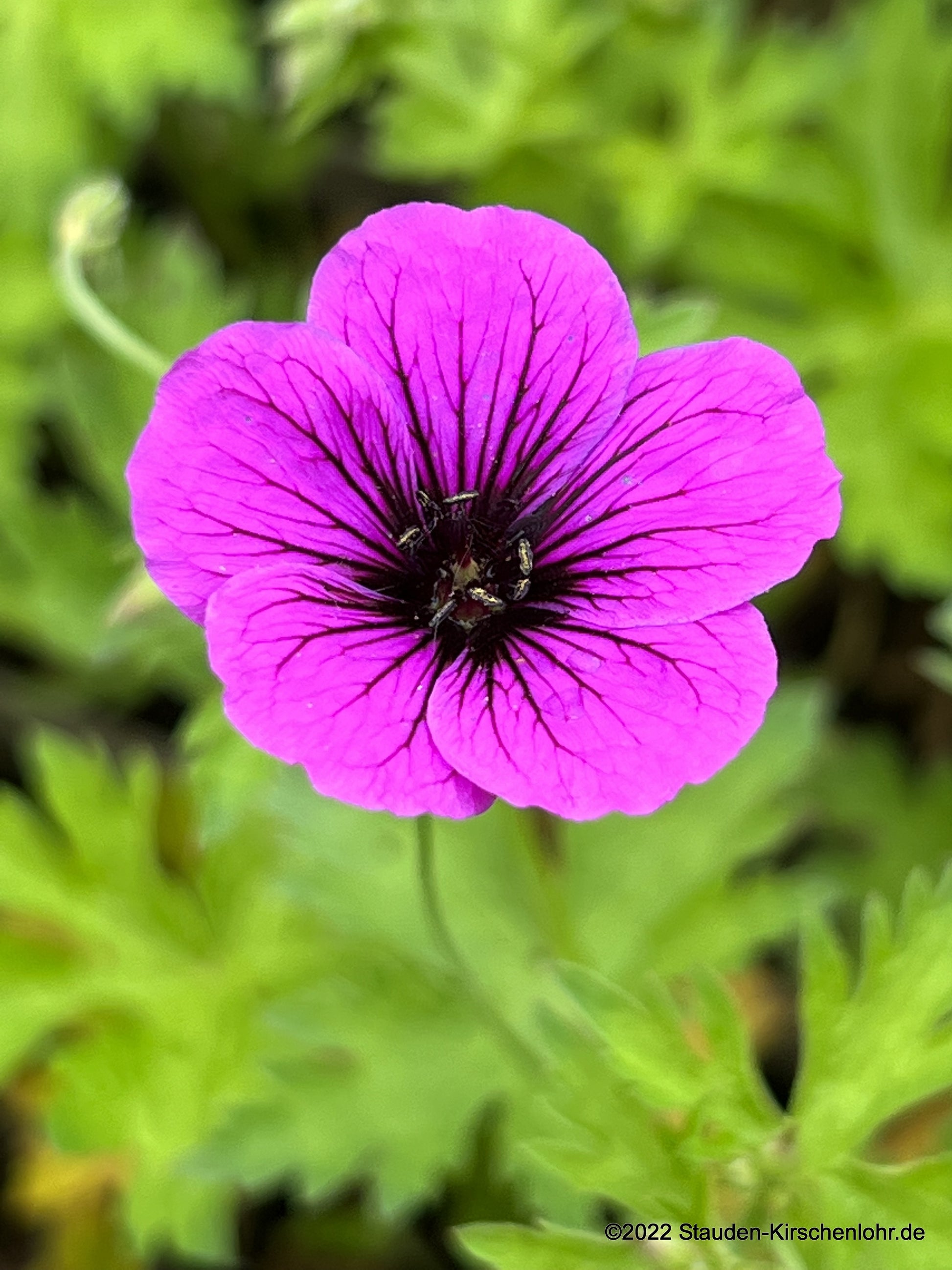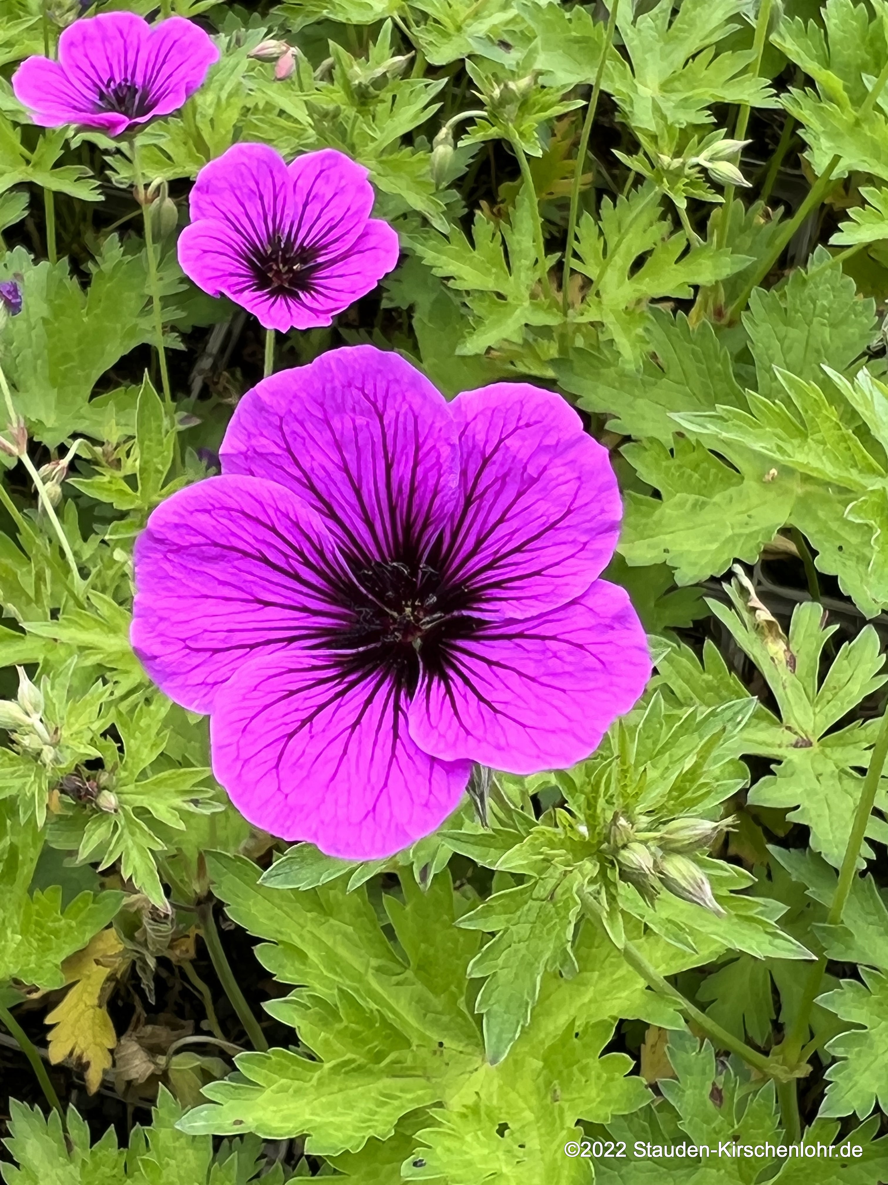 Große, magentarosa Blüten mit schwarzer Augenzone und Blütenblattaderung. In mehrere Abschnitte geteilte Blätter, grob gelappt. Sehr schöner G. psilostemon Abkömmling. Sommergün.