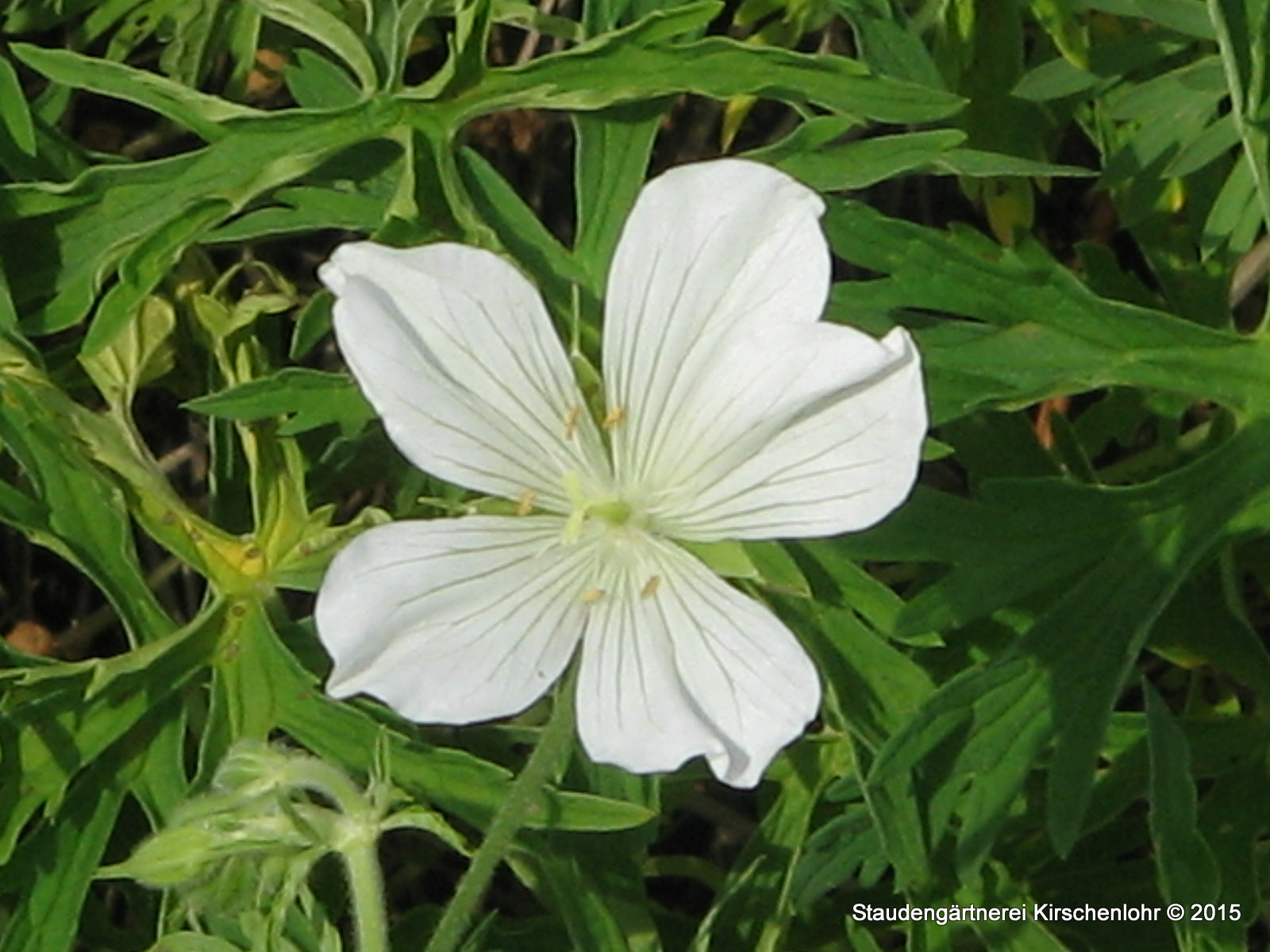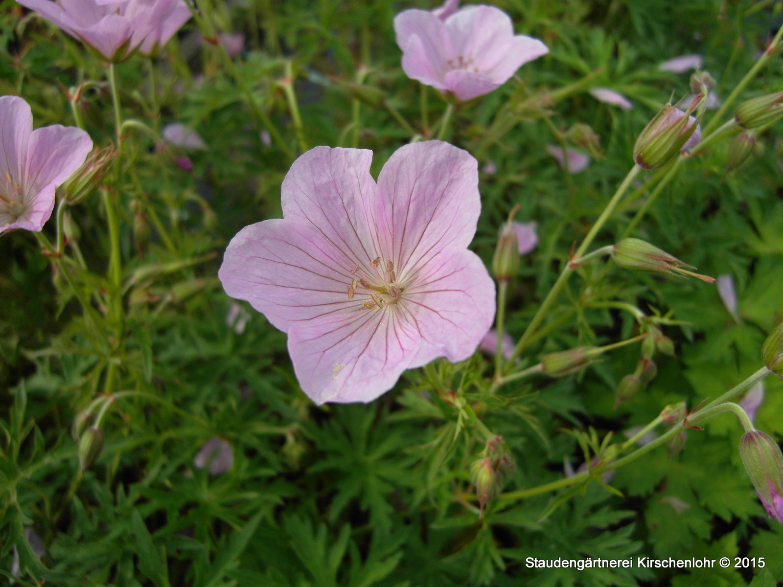 Bezaubernde, große, rosa Blüten mit Aderung. Tief eingeschnittenes Laub. Sommergün.