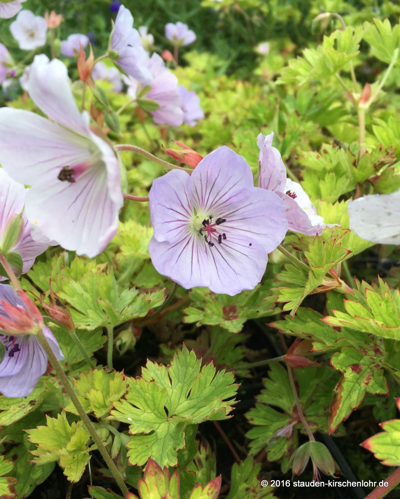 Hell flieder bis eisig zartviolette Blüte. Bis 6 cm Durchmesser. Traumhaft schön! Toller Dauerblüher mit G. wallichianum Blut. Hellgrünes Laub. Sommergün.