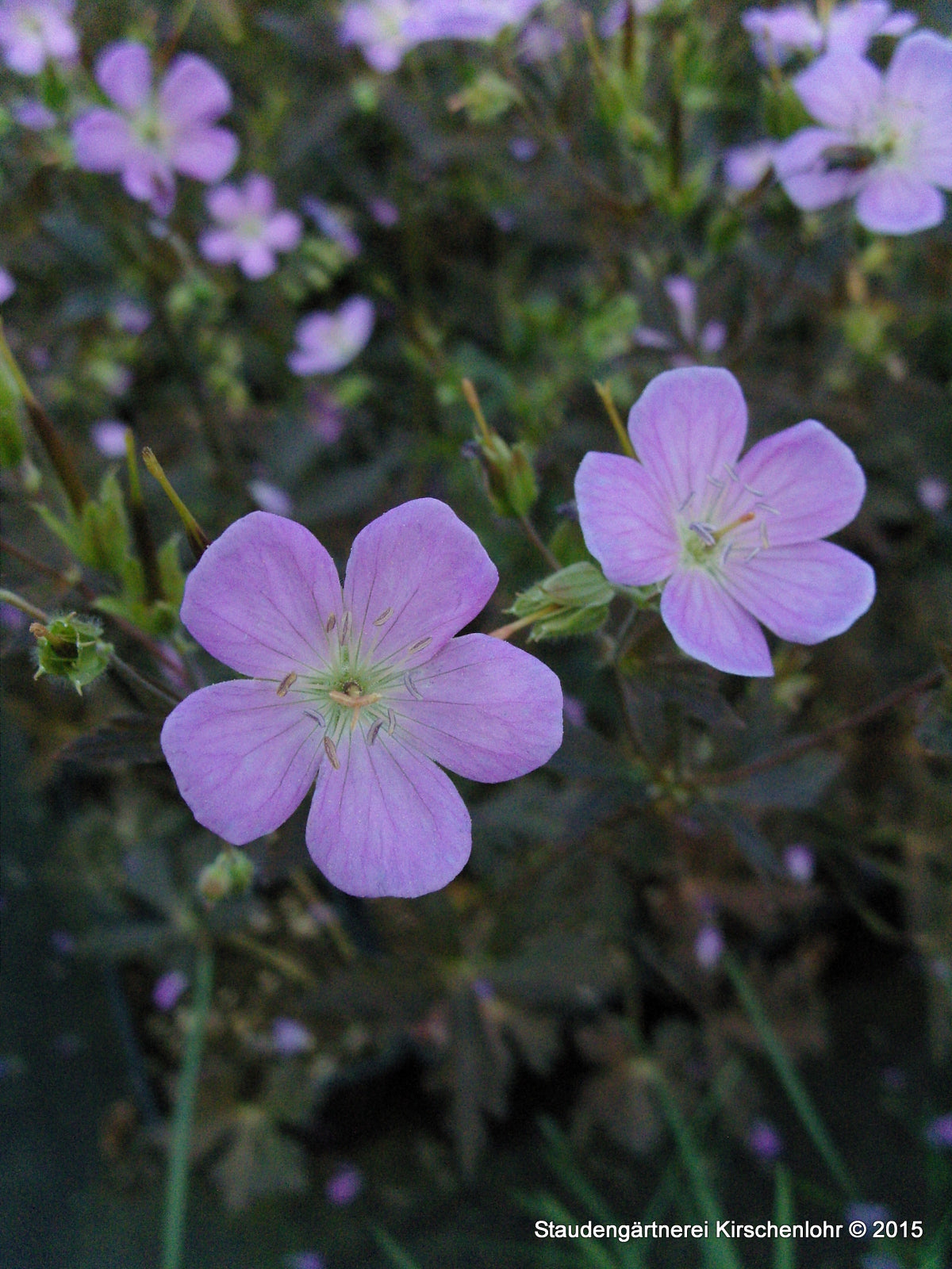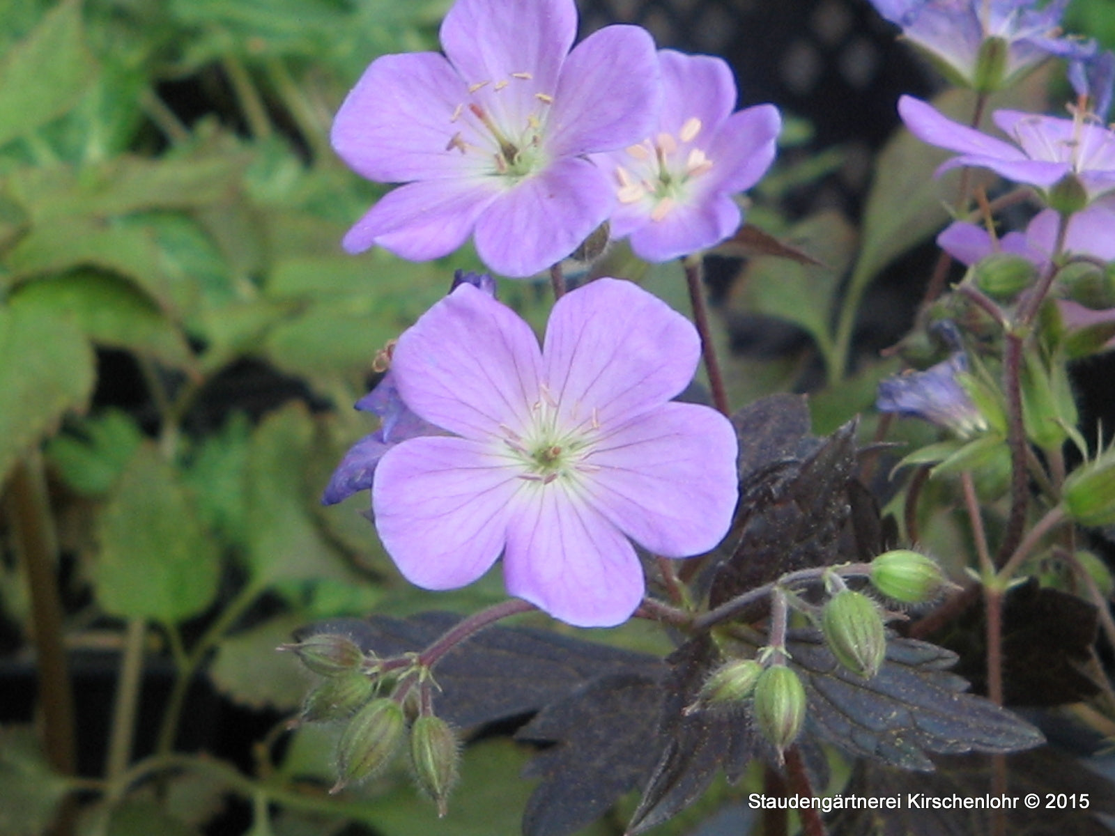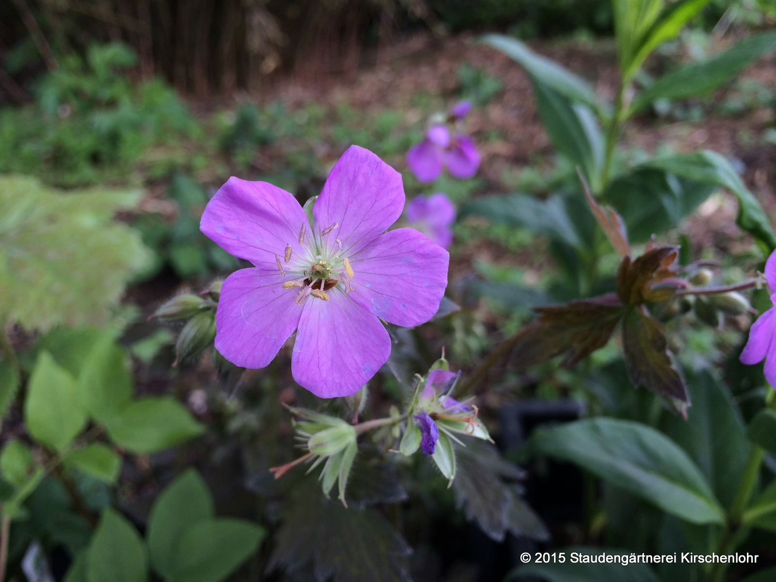 Lilarosa Blüten. Üppig und sehr früh blühend. Dunkelbraune, in mehrere Abschnitte geteilte Blätter. Sommergrün.