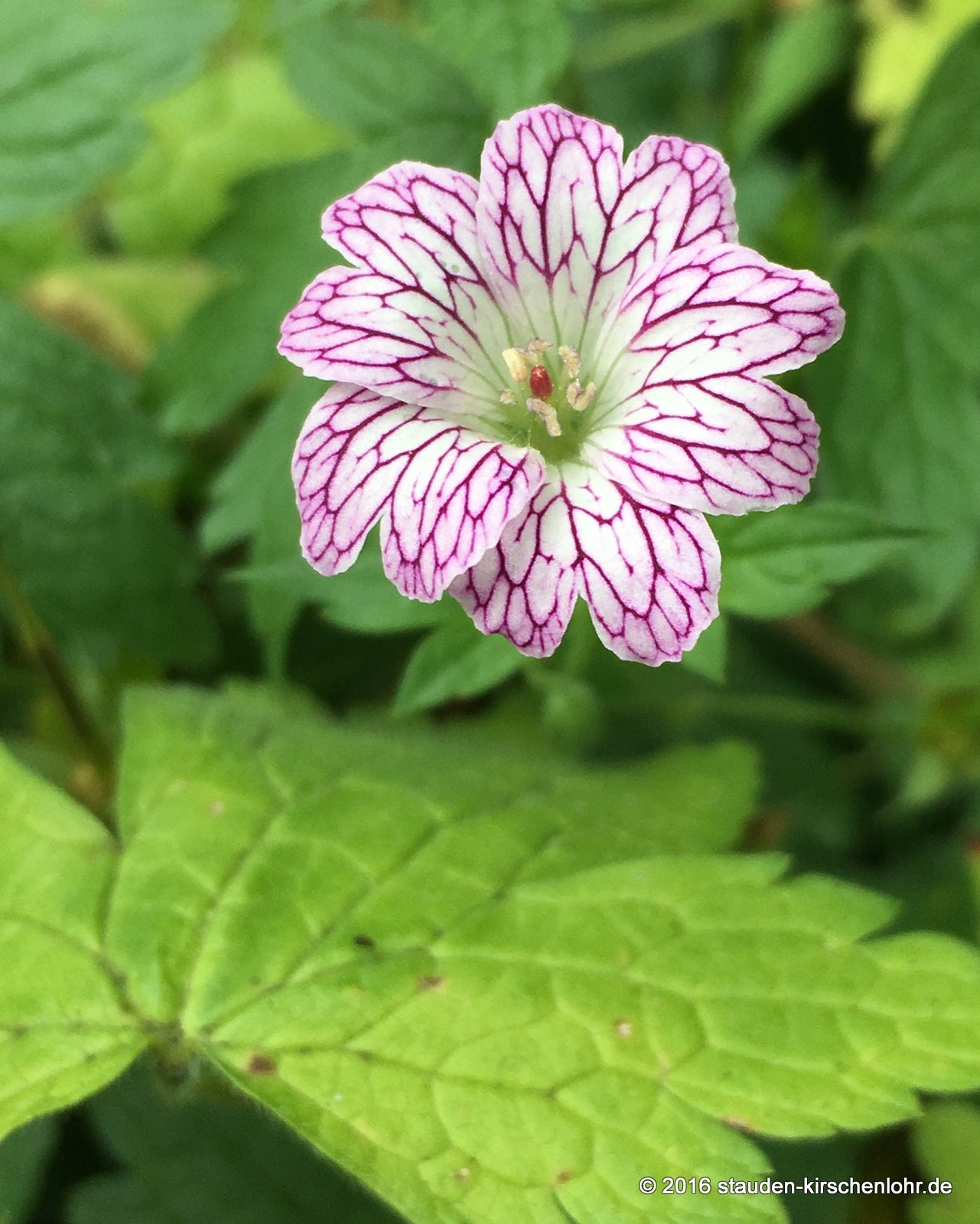 Rosaweiße, netzartig gezeichnete Blüten. Ideal für flächige Gehölzunterpflanzungen. Frischgrüne, in drei bis fünf Abschnitte getreilte Blätter. Sommergrün.