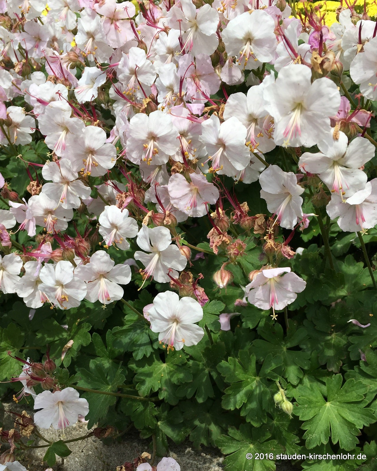 Weiße, im Abblühen hellrosa Blüten. Gelappte, aromatisch duftende Blätter. Bildet kurze Ausläufer. Hybride aus G. dalmaticum x G. macrorrhizum. Wintergrün.