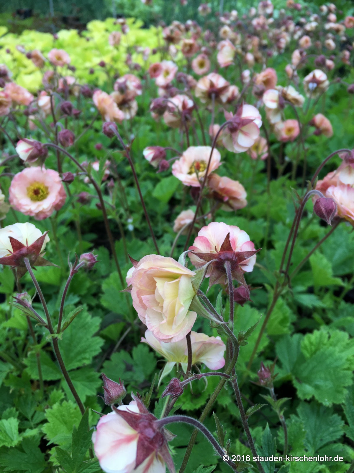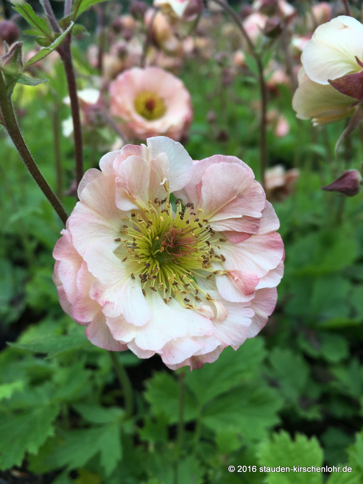 Hell aprikosenrosa Blüten. Reichblühend. Wintergrünes, spatelförmiges Laub, gefiedert. Kompakter Wuchs.
