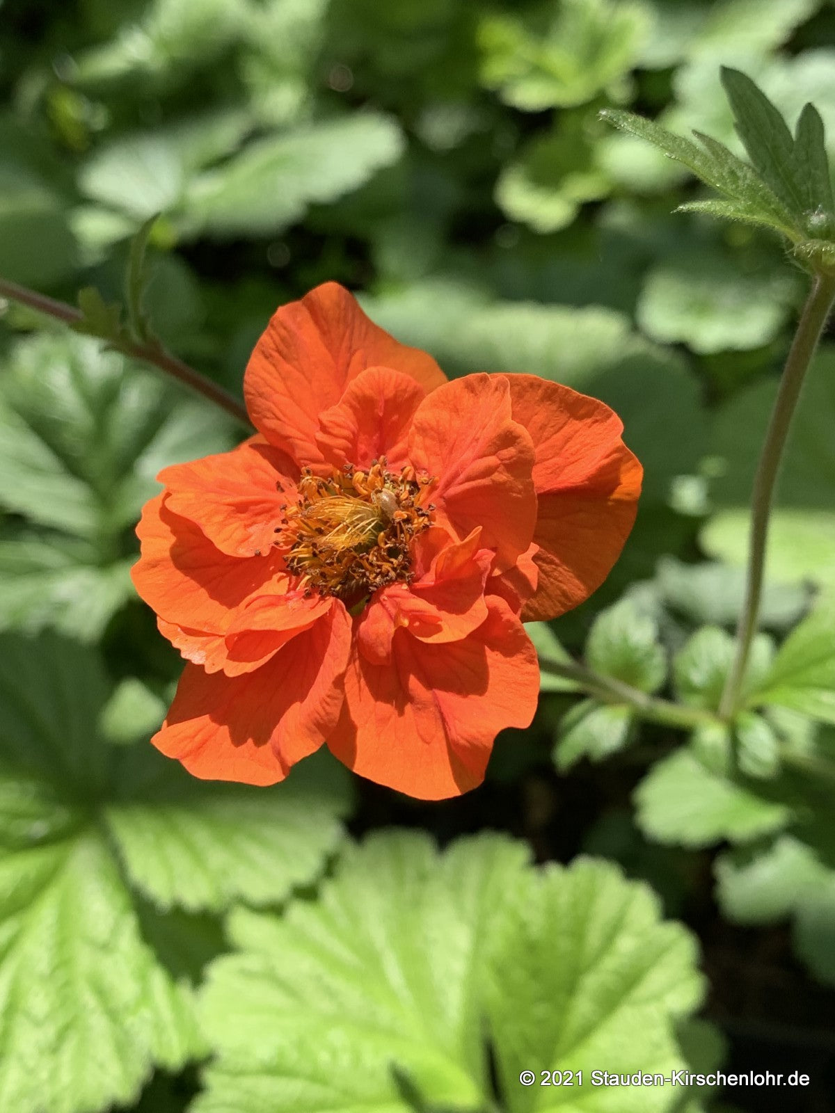 Große, halbgefüllte, menningrote Blüten. Reichblütige, Sorte. Spatelförmige, gefiederte Blätter. Tiefgrüne Blätter. Wintergrün. (syn. G. coccineum 'W. A.').