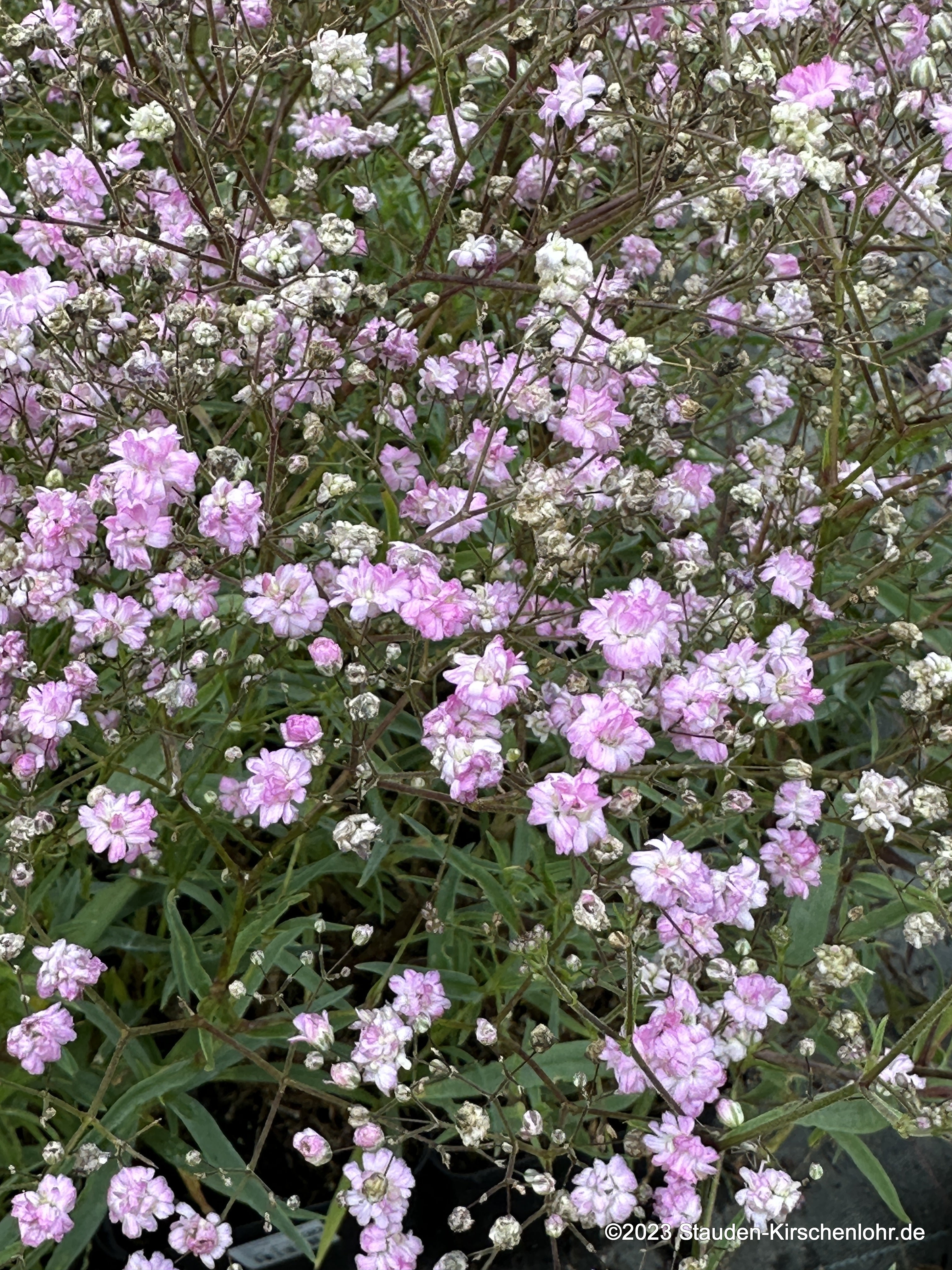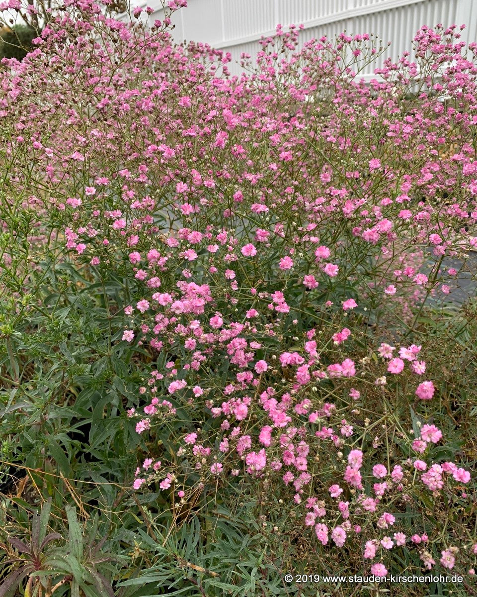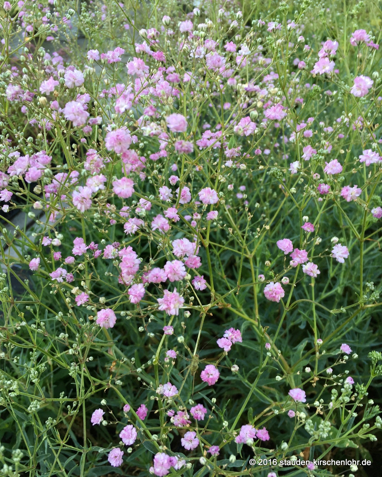 Große, rosagefüllte Blüten in reichverzweigten Doldenrispen (schleierartig). Lineales bis lineallanzettliches, graugrünes Laub. Sommergrün.