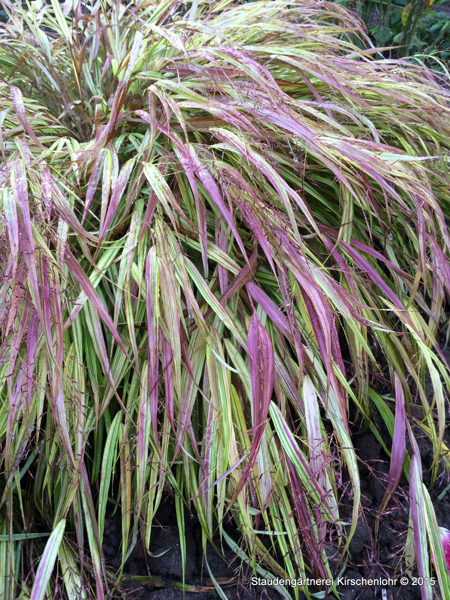 Grüne Blütenrispen. Grüne Blattschöpfe mit intensiv gelber Streifung. Fantastischer Klon mit auffälliger, rötlich getönter Herbstfärbung. Sommergrün.