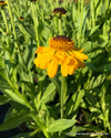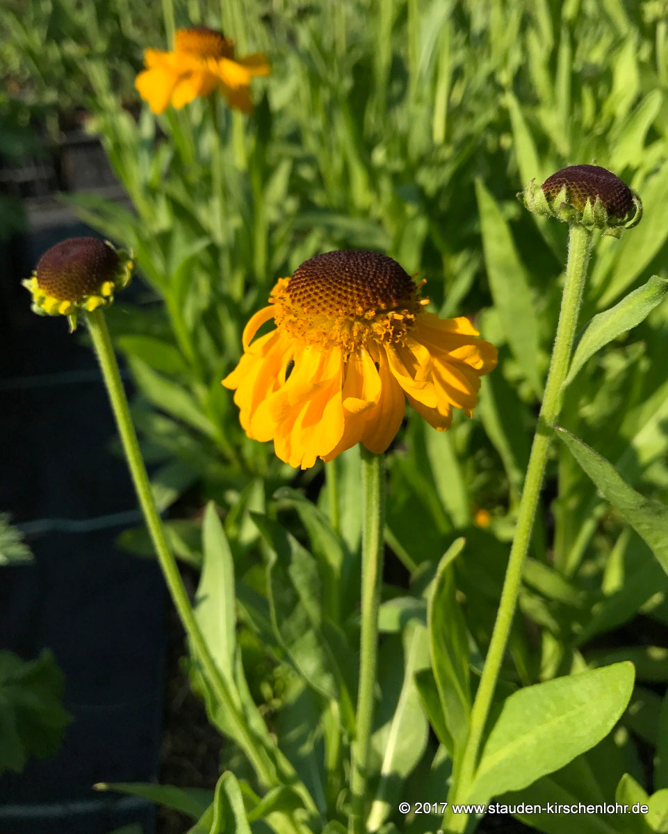 Leuchtend gelbe Blüten. Blütenscheibe hochgewölbt, braun. Zungenblüten schräg nach unten gerichtet. Doldentraubiger Blütestand. Tiefgrüne, lanzettliche Blätter entlang der Stängel.