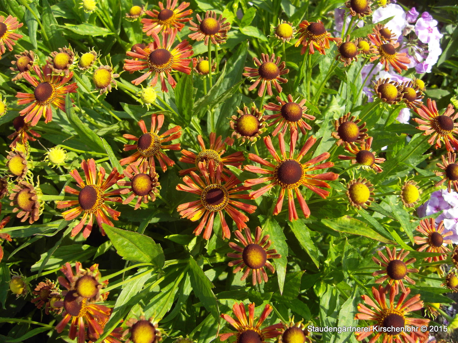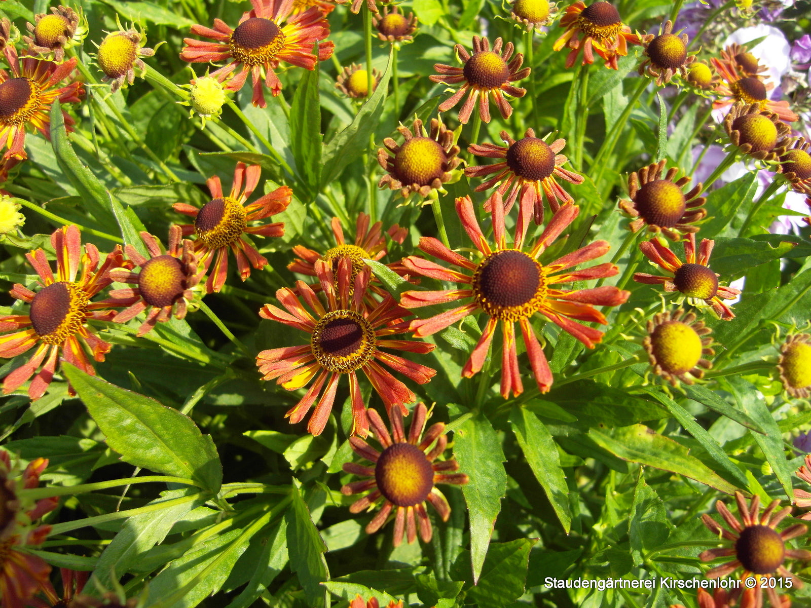 Am Rand nach oben gebogene, kupferbraune Blütenblätter; die Innenseite ist gelb. Zwischen den Blütenblättern ensteht so ein deutlicher Abstand. Interessant! Sehr reichblütig und sehr gute Blütenschmuckwirkung.