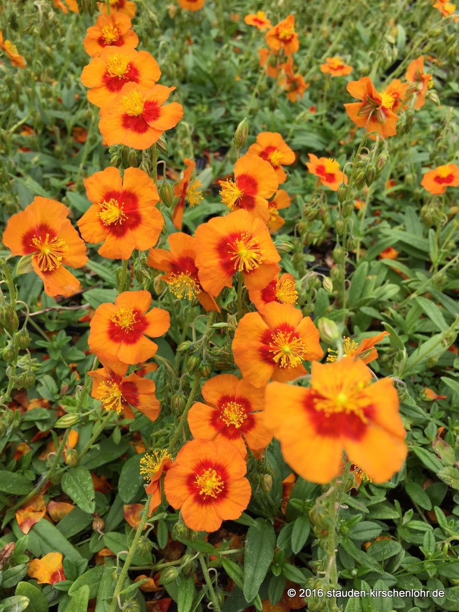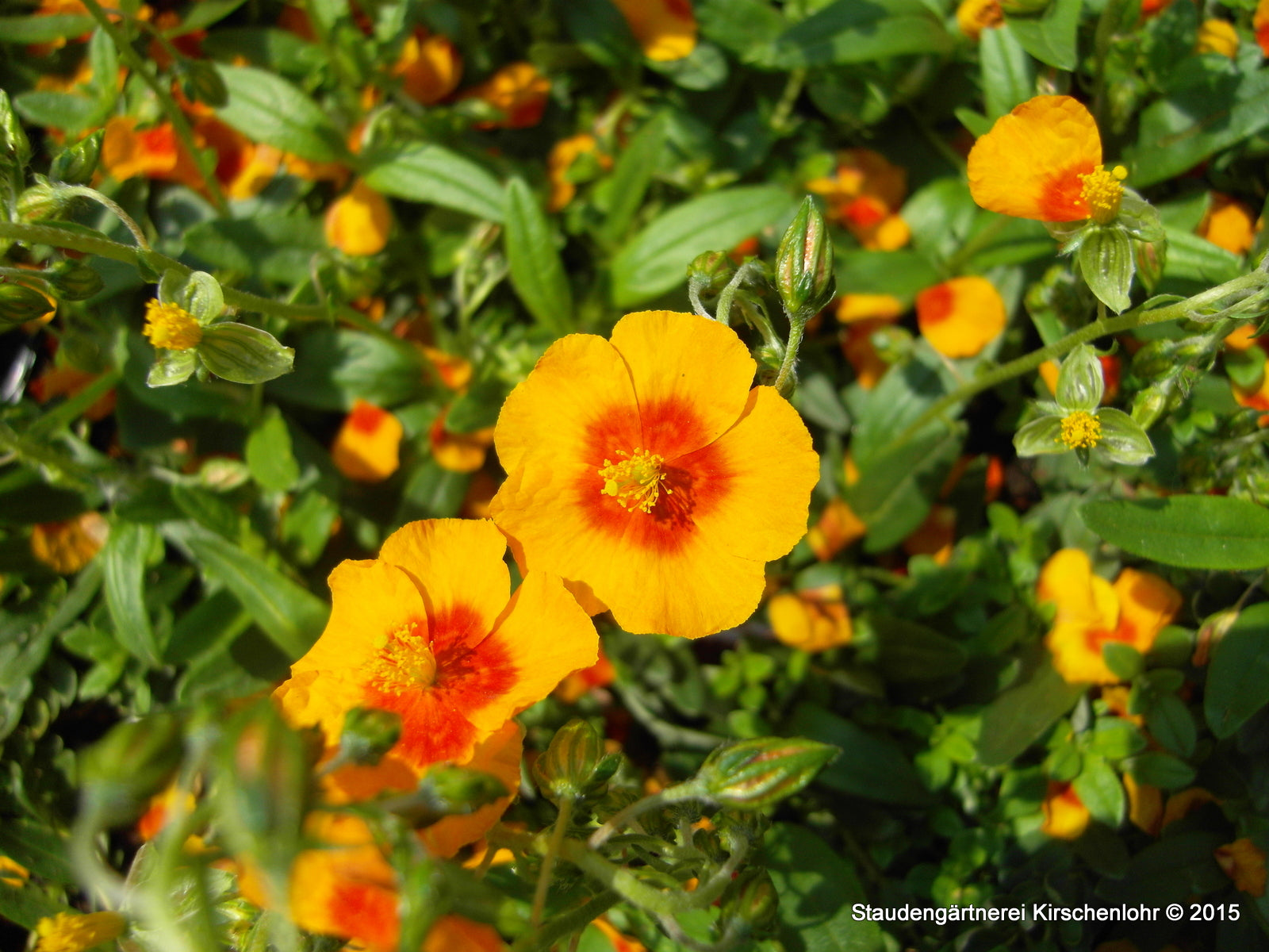 Braunrorange Blüten mit roter Augenzone. Aufrechter, dichtbuschiger Wuchs. Dunkelgrünes, länglich-ovales Laub an etwas verholzenden Trieben.