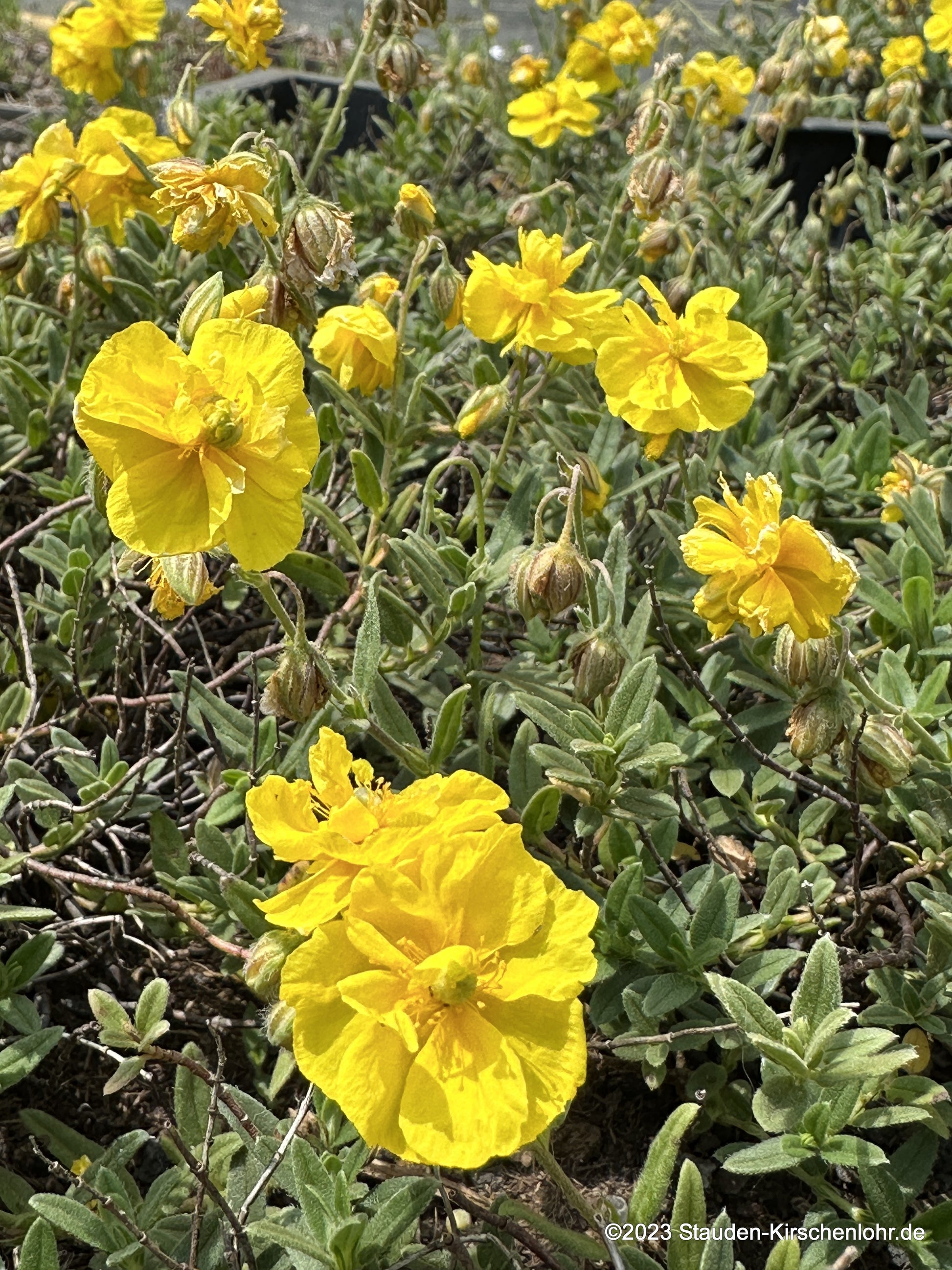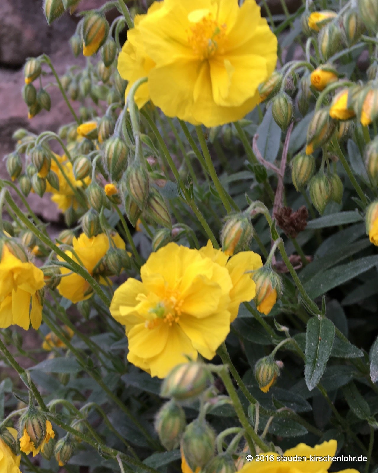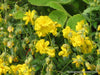 Leuchtendgelbe Blüten.Halbgefüllter Blütenaufbau. Grünes, länglich-ovales Laub. Sehr flaches Wuchsbild.
