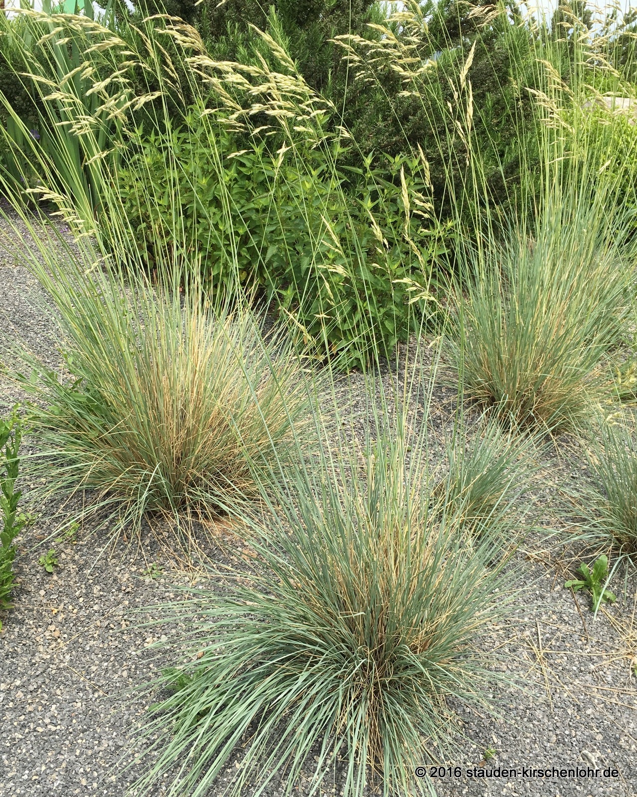 Gelbliche Blütenrispen an langen bogig geneigten Trieben. Starre, blaugraue, lineale, wintergrüne Blätter erreichen eine Endhöhe von 35 bis 40 cm. Wintergrün. syn. Avena