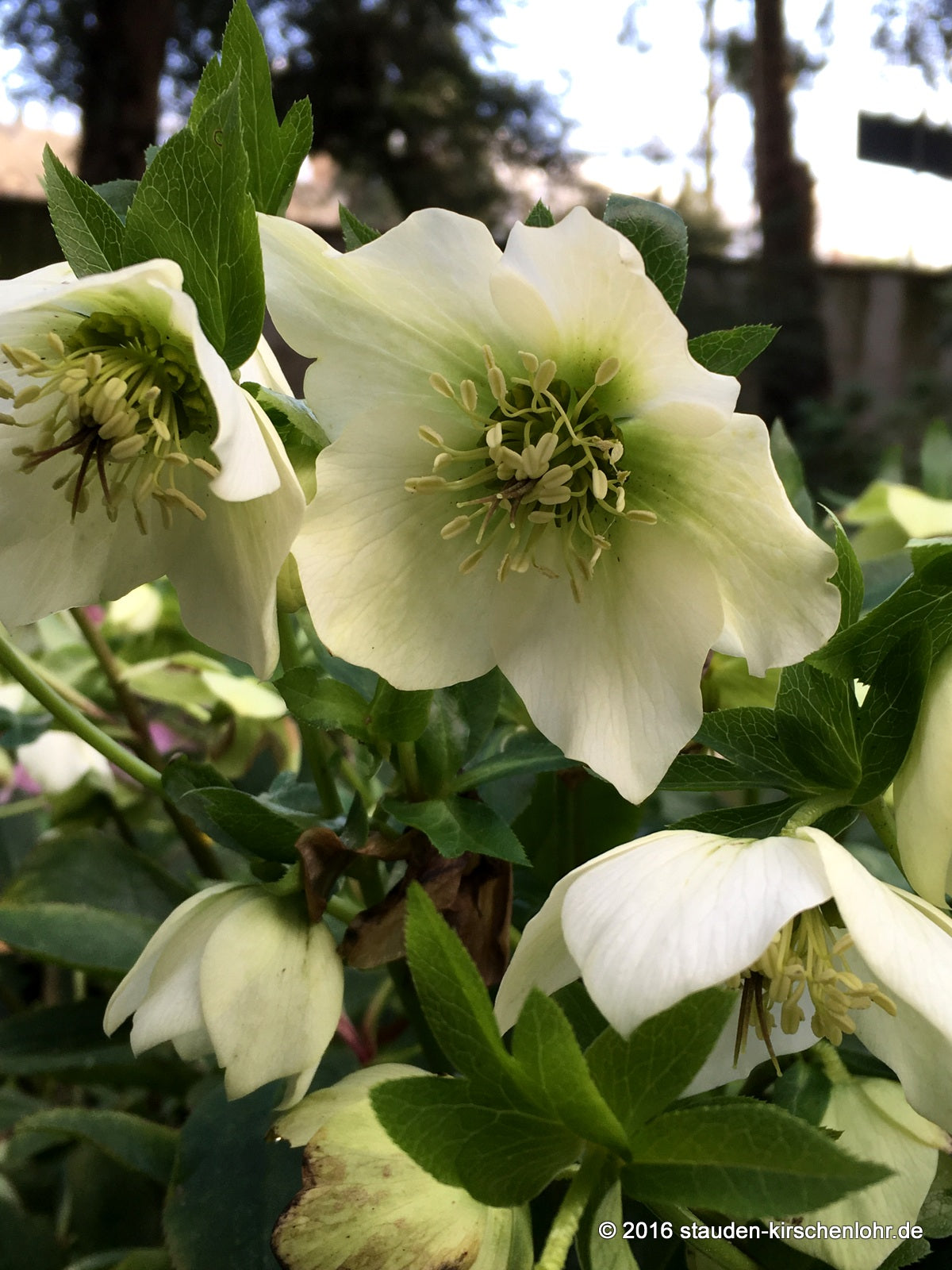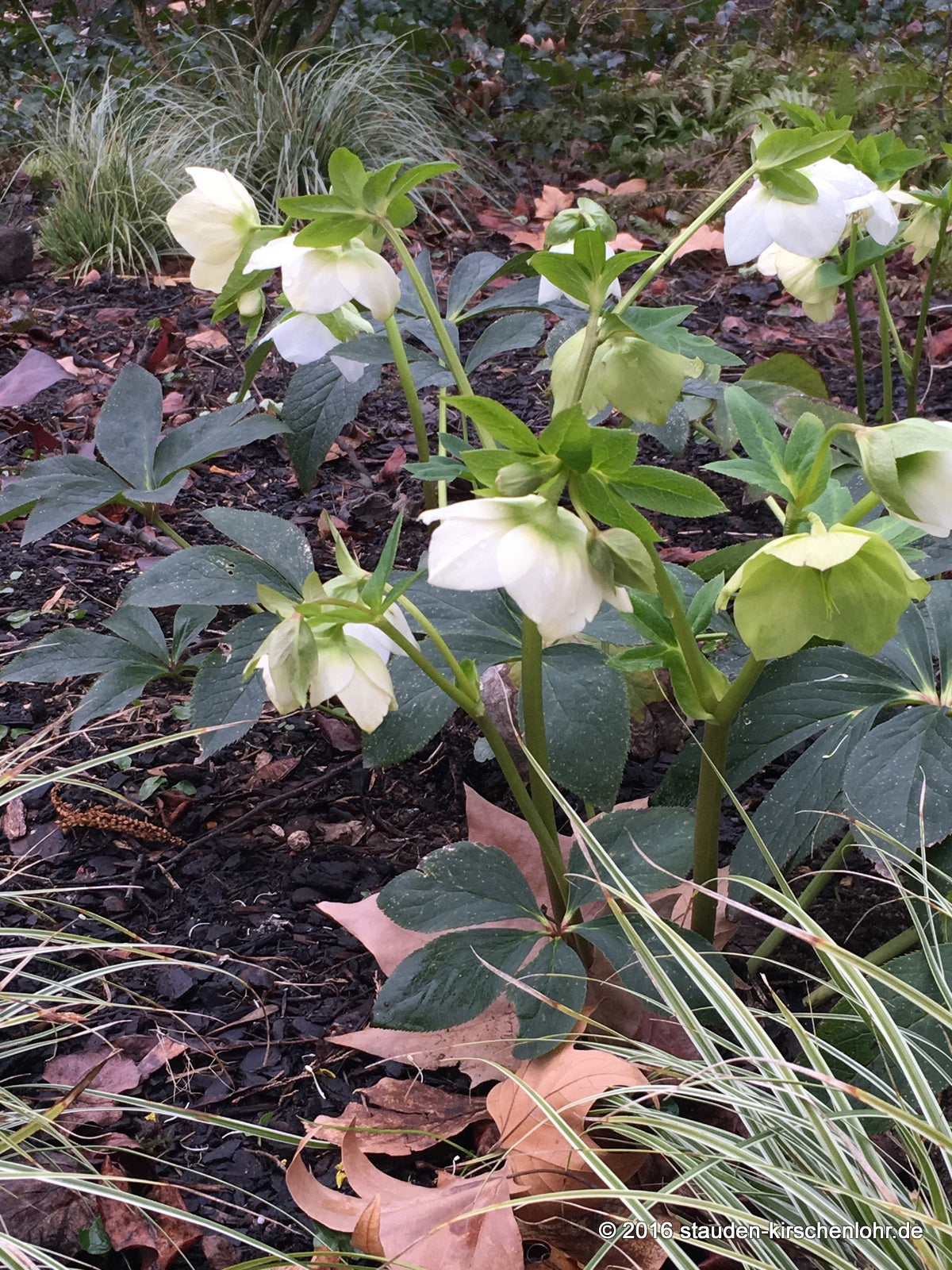 Weiße, leicht nickende Blüten auf starken Stielen. Bis über 8 cm großen Blüten. Hervorragende Wuchseigenschaften. Fingerförmiges, wintergrünes Laub.