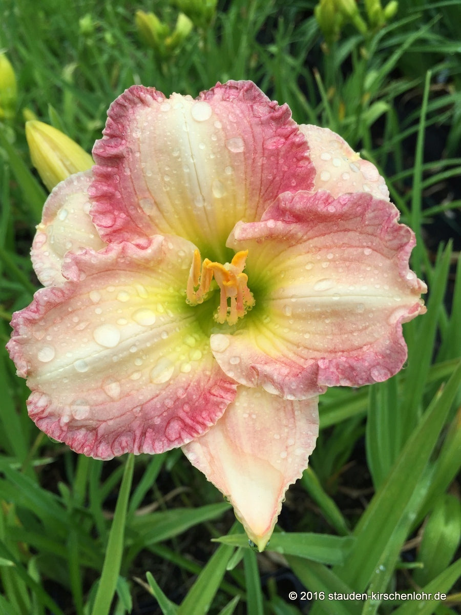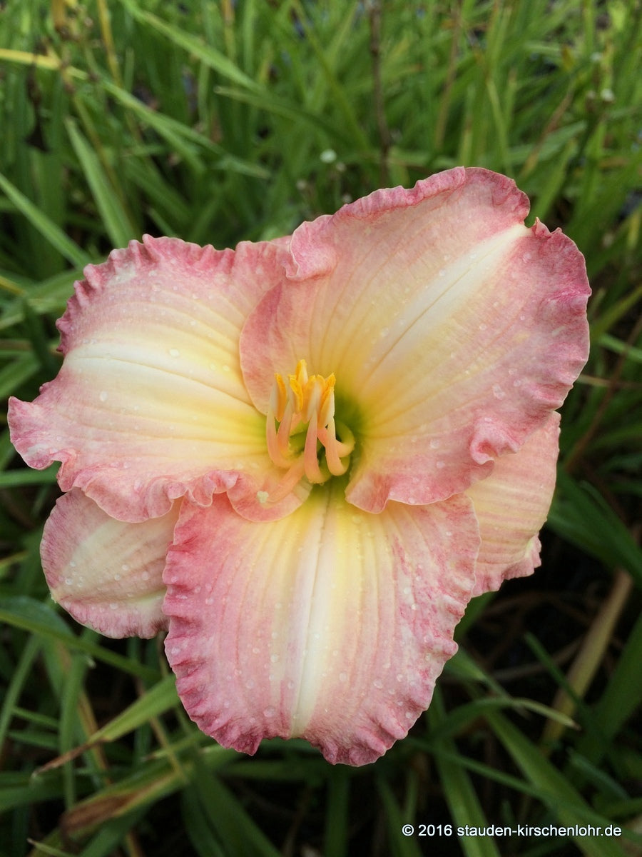 Melonengelbe Blüten mit gewelltem, rosa Blütenrand. Gelber Schlund. Großblumig. Sehr selten angebotene Sorte.