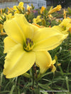 Eindrucksvolle Sorte mit hellgelben, einfarbigen Blüten und grünem Schlund. Leicht gewellte Blütenblätter. Heller Mittelstrich. Großblumig. Tamberg (D).