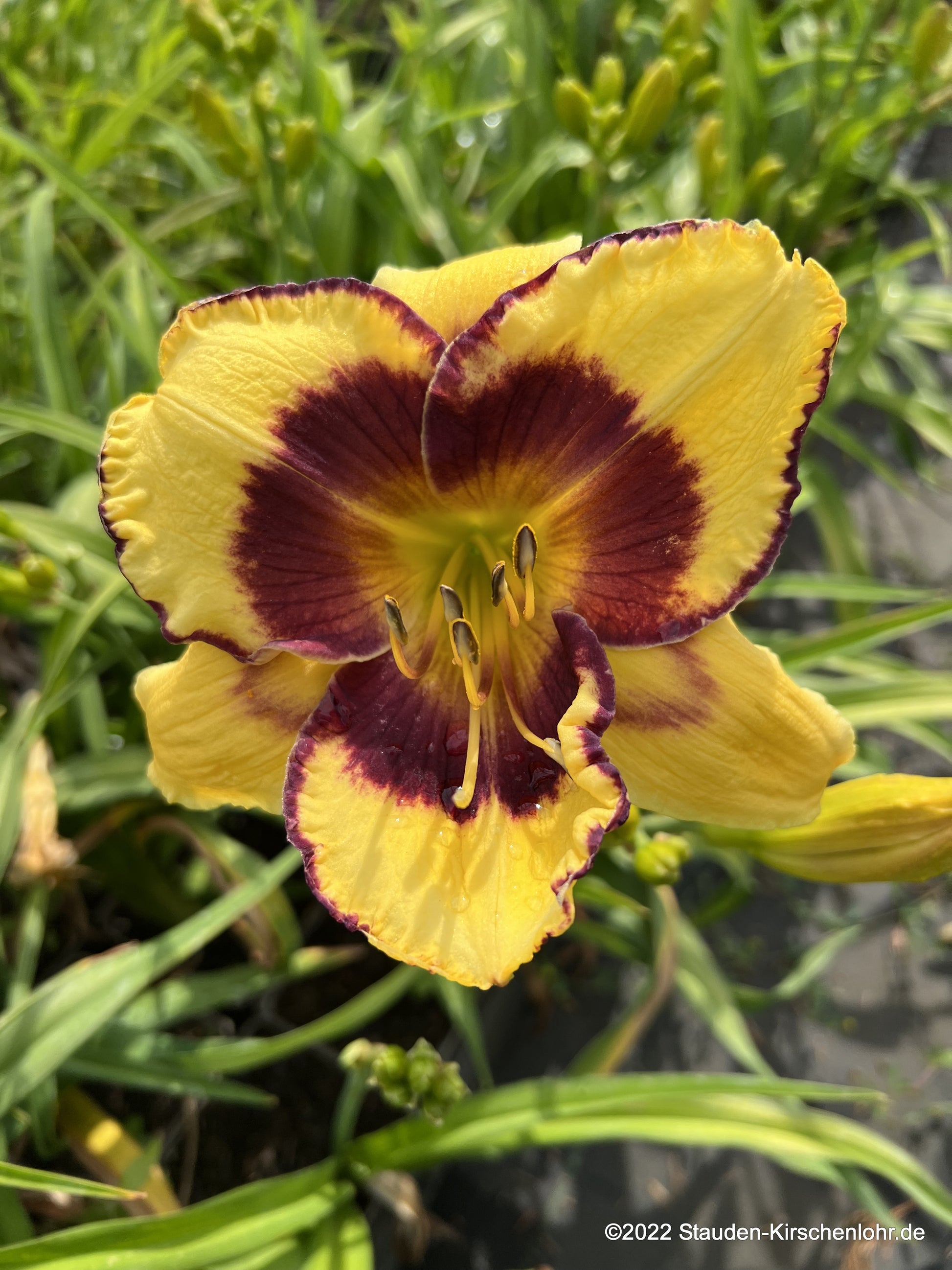 Wunderschöne, gelbe Sorte mit riesigen, kräftig Pflaumenfarbenem Auge und Rand. Gelber bis grüngelber Schlund. Auszeichnungen: HM 2003. Immergrünes Winterlaub.