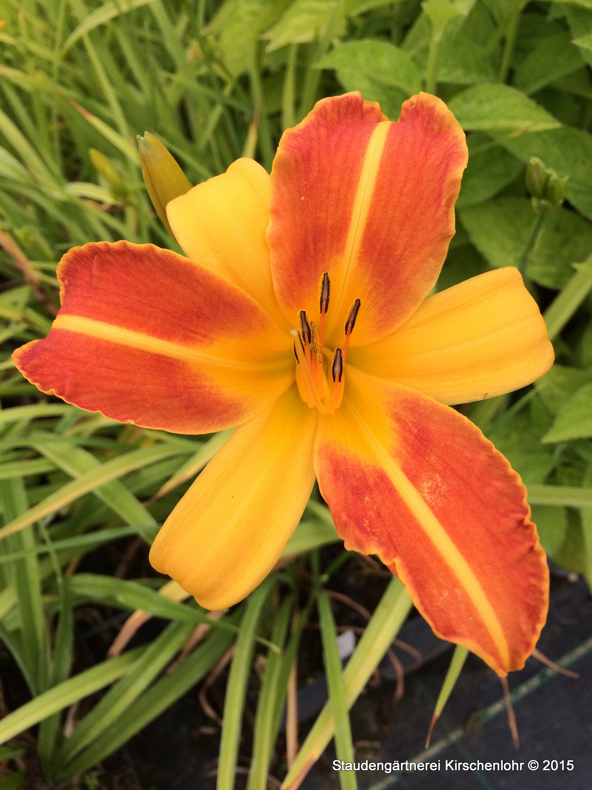 Zweifarbige Sorte. Goldgelbe und rostbraune Blütenblätter. Die rostbraunen Blütenblätter haben eine goldgelbe Mittelrippe. Beliebter Klassiker. Großblumig.