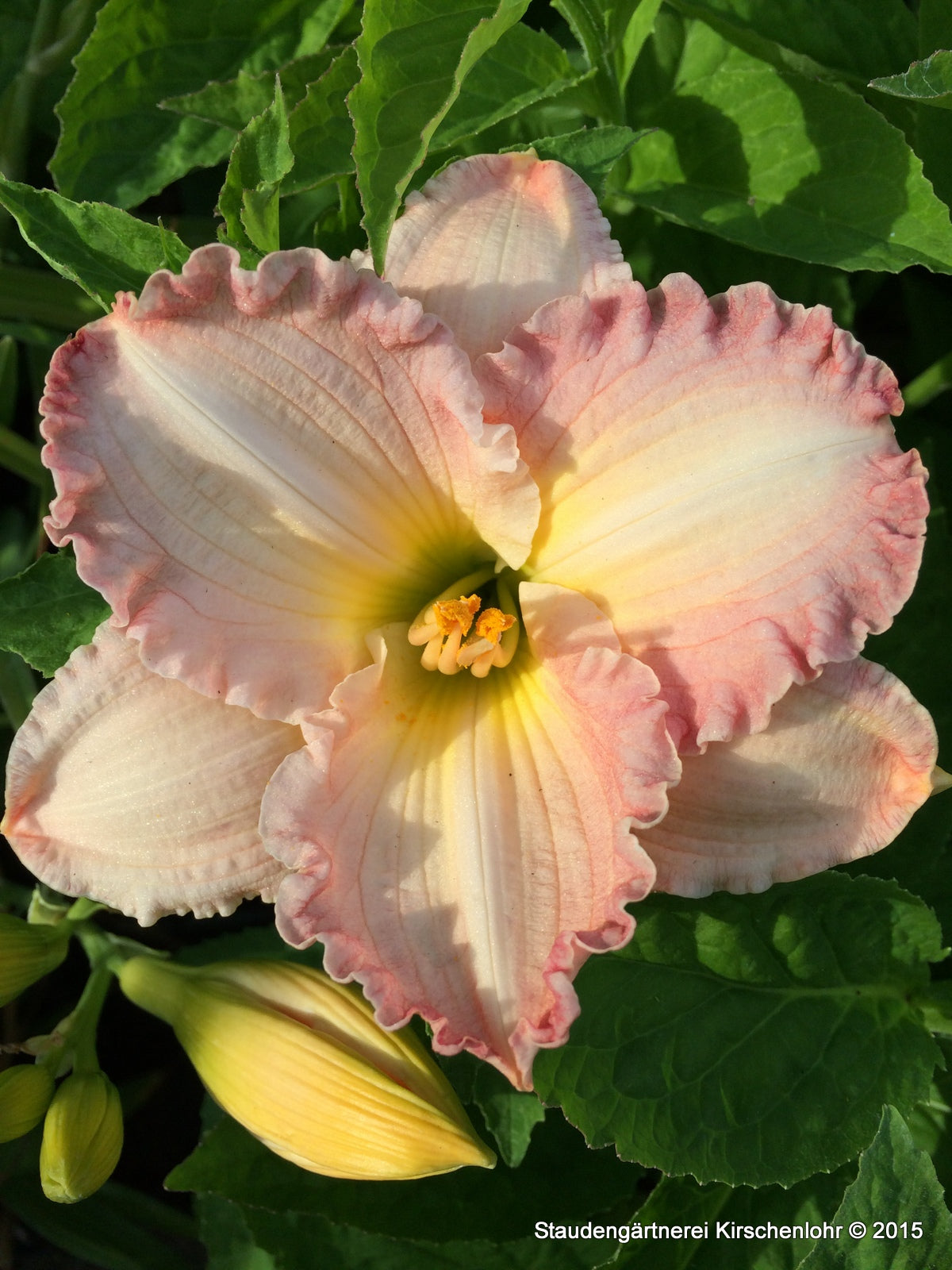 Creme- bis hell melonenfarbene Blüten die zum leicht gerüschten Saum hin, rosa färben. Grüngelber Schlund. Großblumig.