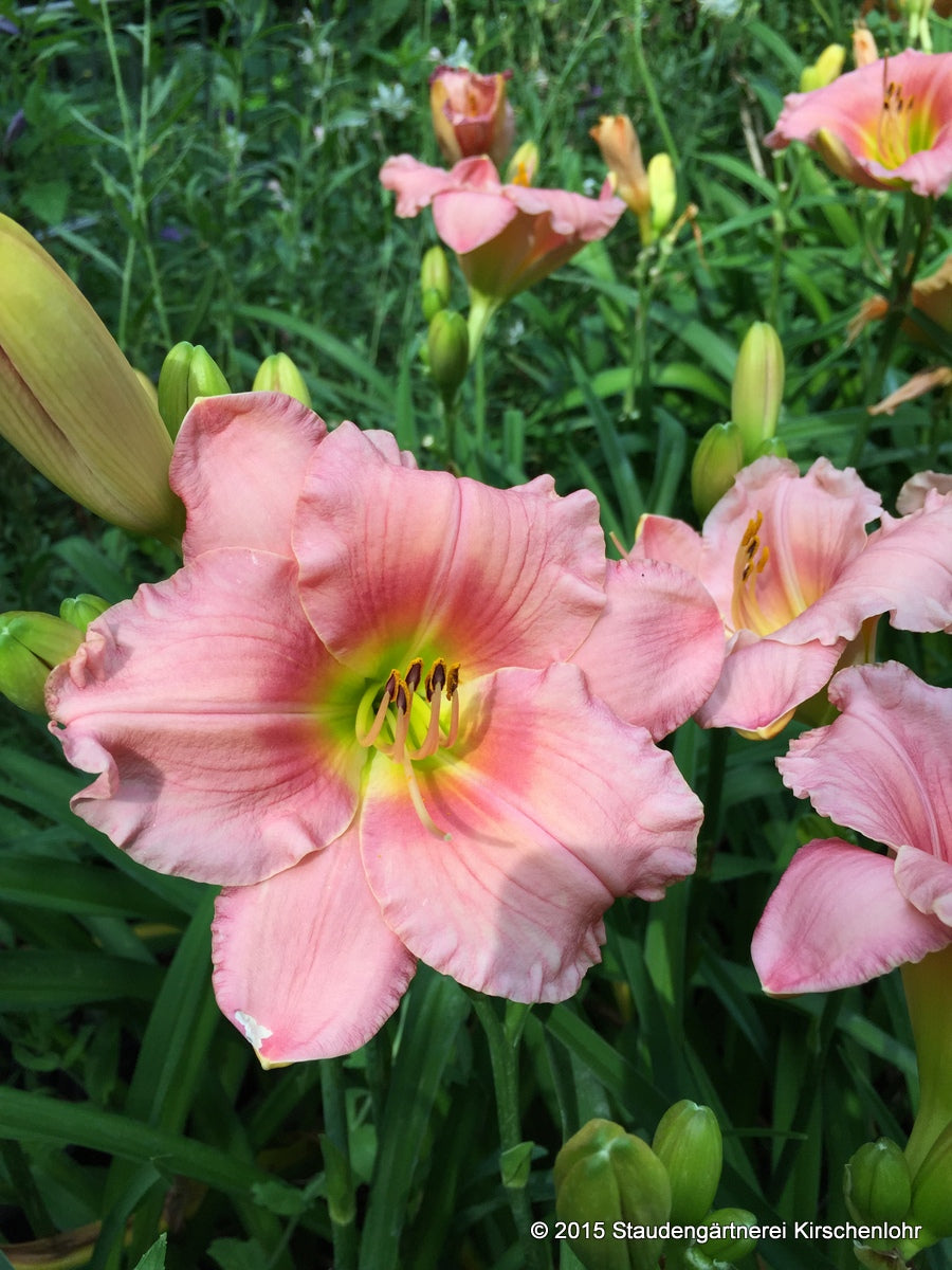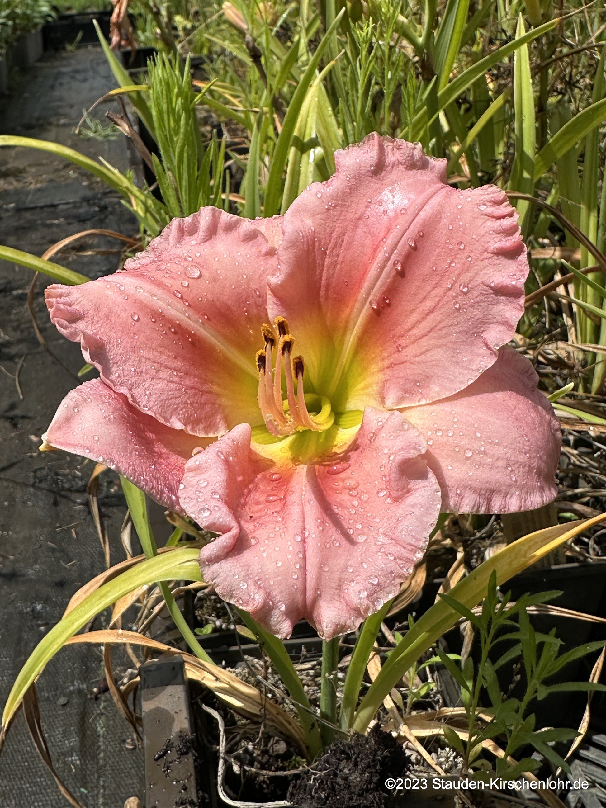 Reinrosa Blüten. Perfekt geformt. Etwas dunklere Augenzone. Grüner Schlund. Saum der Blütenblätter sind leicht gerüscht.