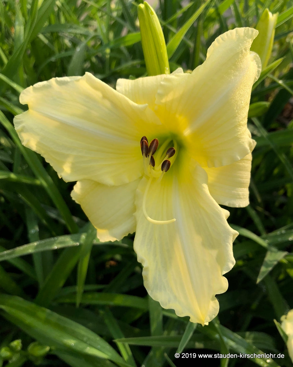 Hellstes Zitronengelb mit grünlichem Schlund. Weiße Mittelrippe. Großblumig. Begehrte, wunderschöne Sorte!