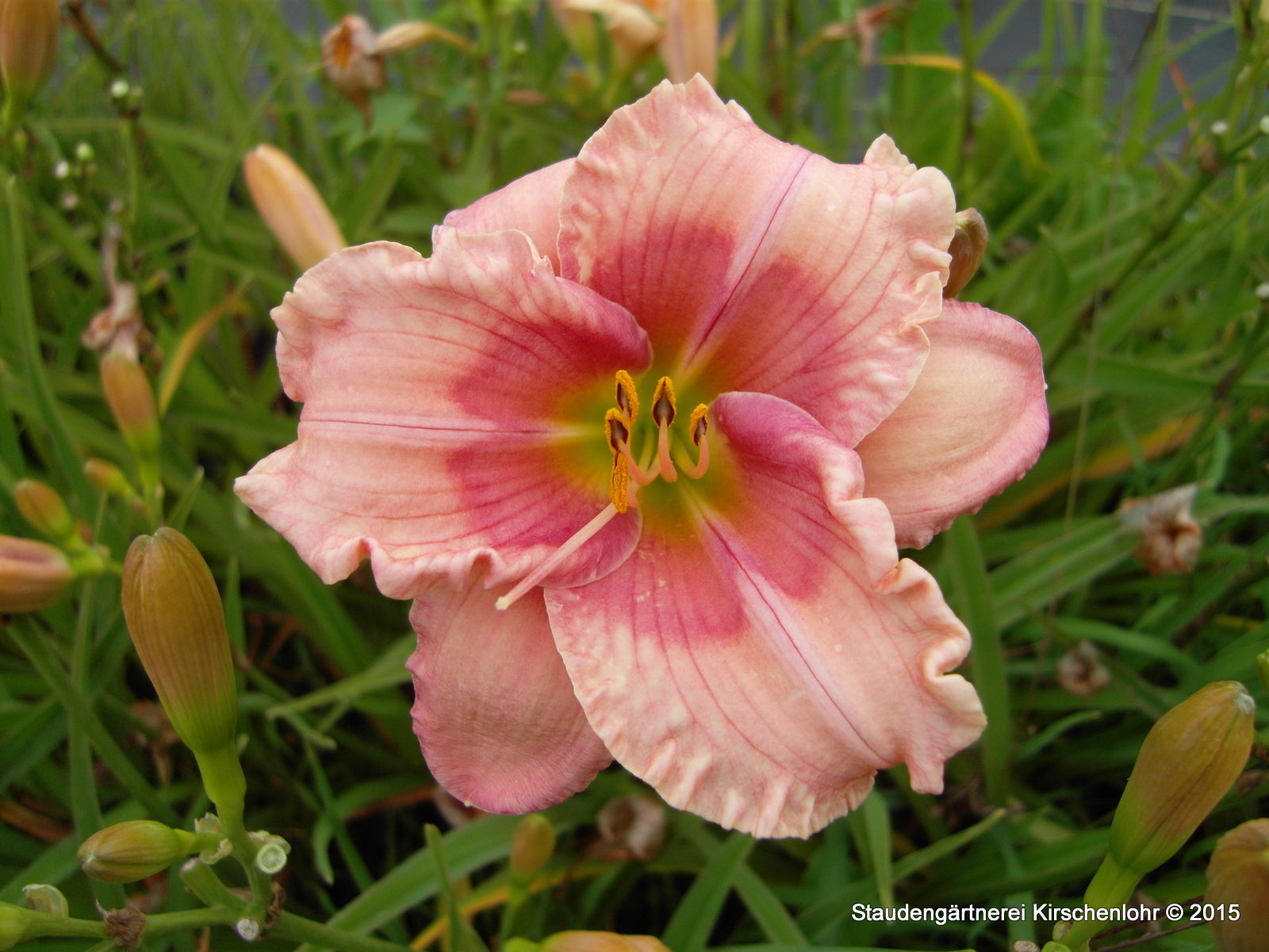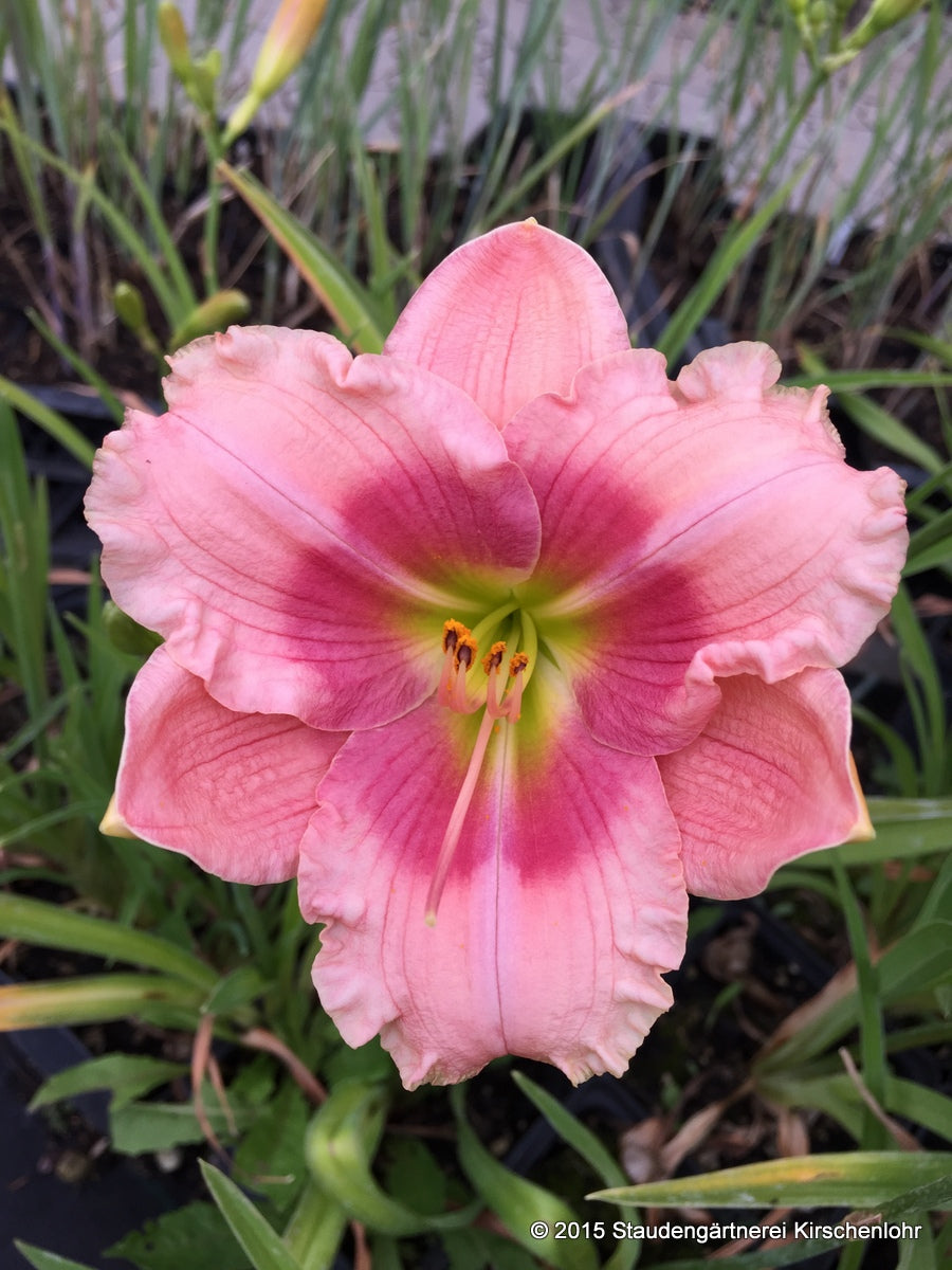 Klar hellrosa Blüten mit kräftig himbeerrosa Augenzone und grünem Schlund. Leicht rund wirkende Blütenform. Blüten mittlerer Größe.