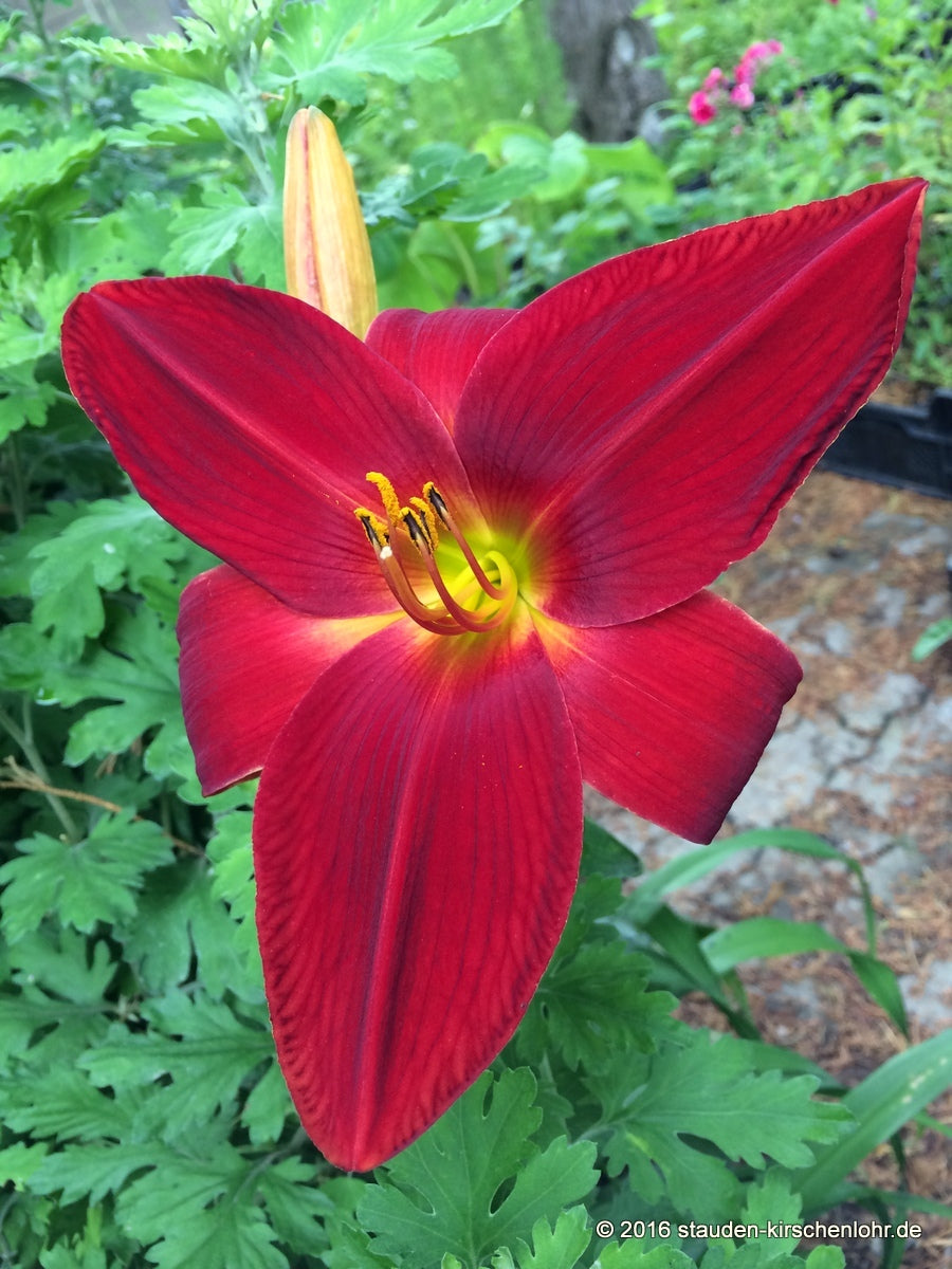 Leuchtendes Rot mit feiner Adernstruktur. Kleiner, gelber Schlund. Hervorragende Sorte von Tamberg. Großblumig.