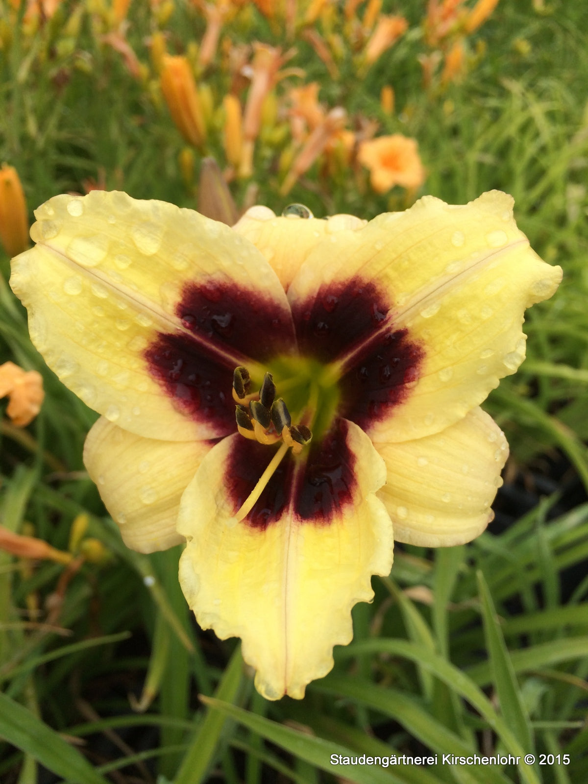 Cremegelbe Blüten mit schwarzpurpurner Augenzone und grünem Schlund.