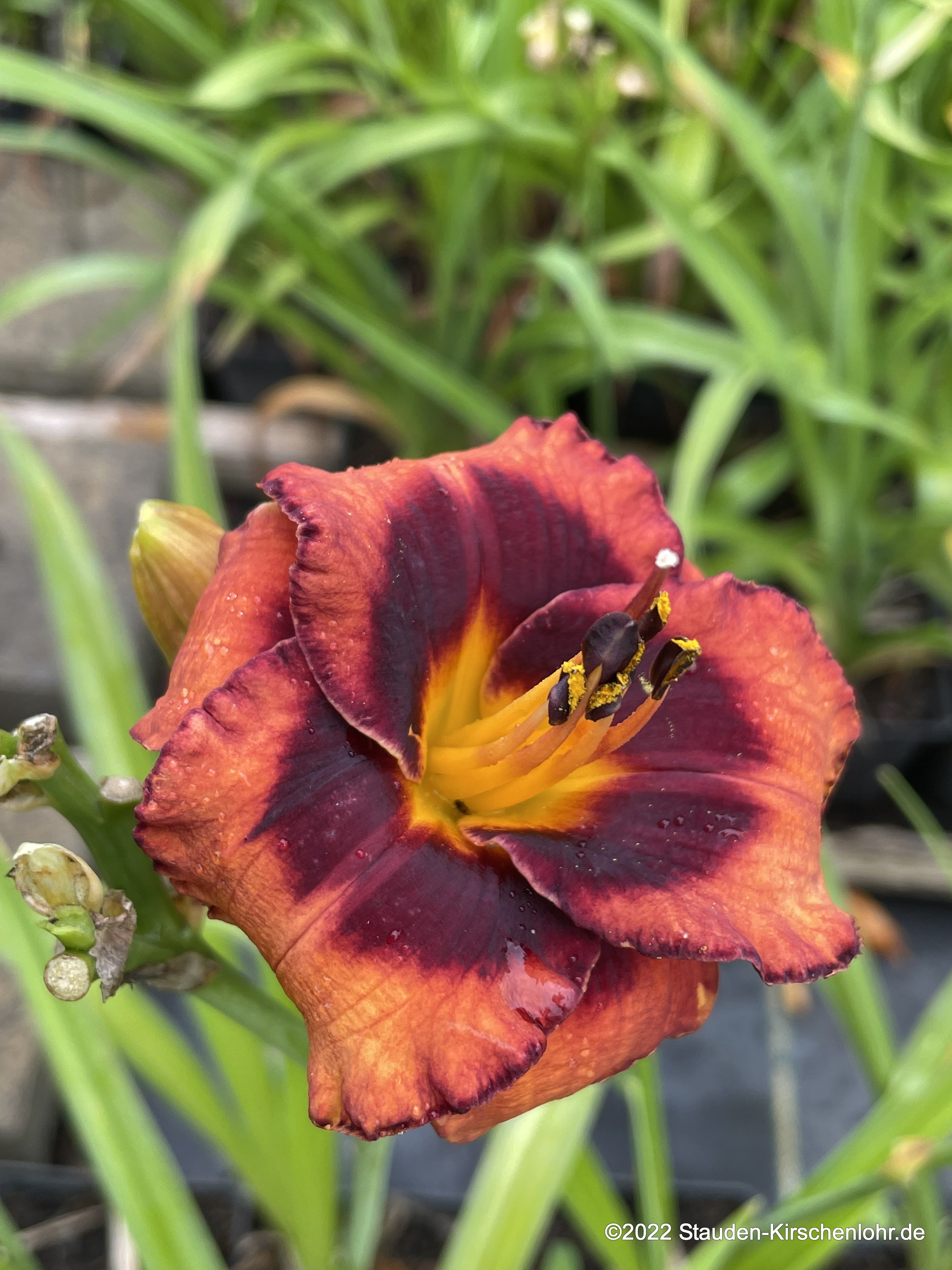 Orangefarbige Blüten mit dunkbraunrotem Auge und gleichgefärbten Blütenrändern. Orangegelber Schlund. Kräftige Blütensubstanz. Kleinblumig.