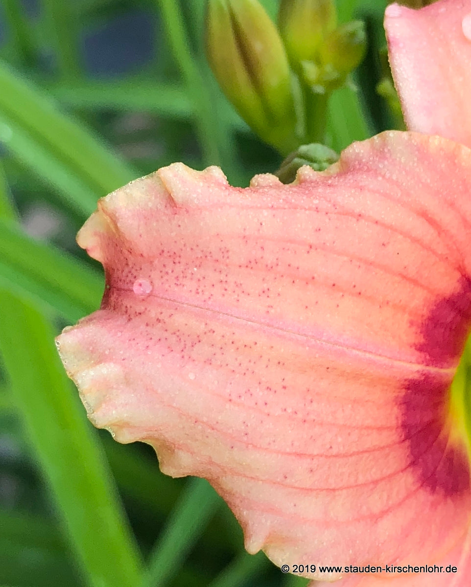 Rosa Blüten mit himbeerfarbener Augenzone und grünlichem Schlund. Interessant punktierte Blütenblätter!