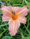 Lachsrosa Blüten mit aprikosenfarbenem Schlund. Blütenblätter am Saum leicht gerüscht. Großblumig.