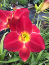 Leuchtend scharlachrote Blüten mit gelblichgrünem Schlund. Breite Blütenblätter deren Ränder leicht gerüscht sind. Großblumig.