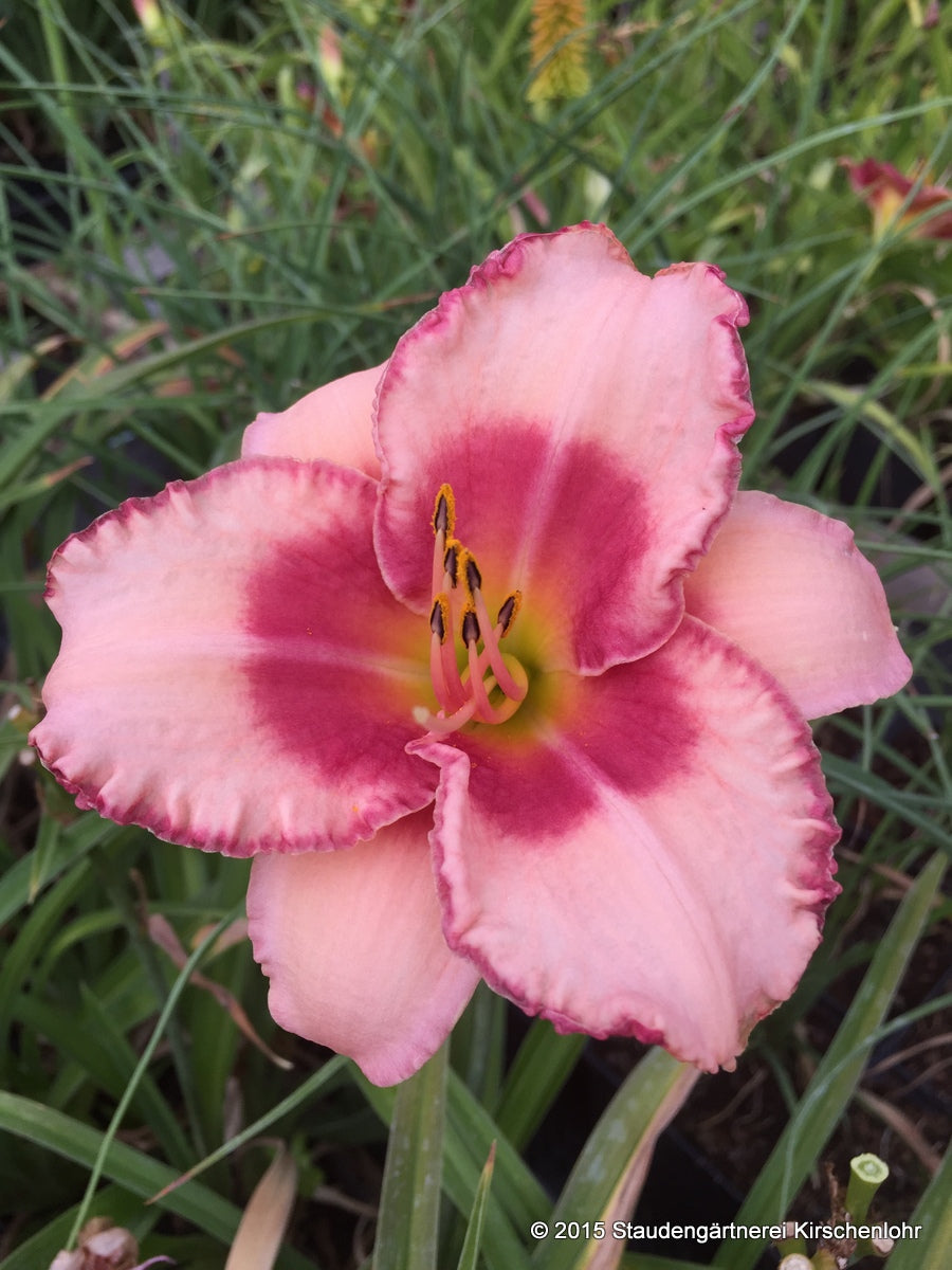 Rosa Blüten mit erdbeerrotem Auge und gleichfarbigen, gerüschten Blütenrändern. Schlund grünlichgelb. Duftet. Großblumig.