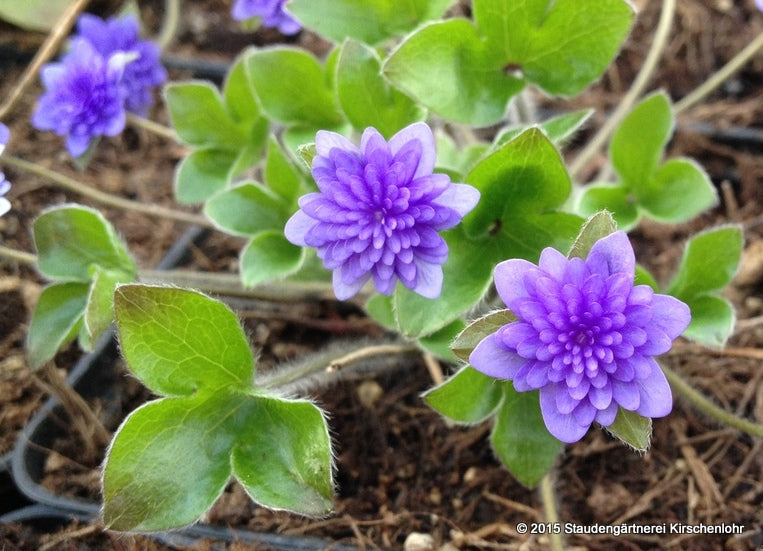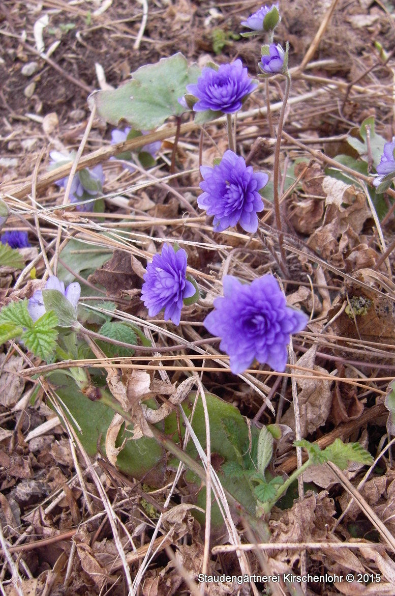 Schalenförmige violettblaue Blüten. Dreilappige Blätter.