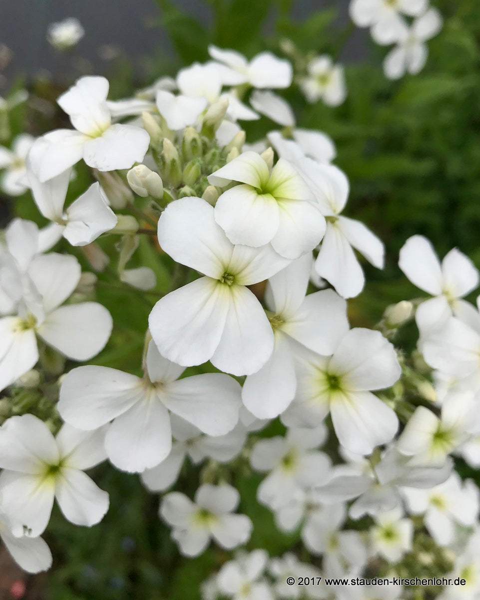 Zahlreiche meist weiße Blüten in traubigem Blütenstand. Lanzelliche Blätter mit gesägtem Blattrand. Grundständige Blätter, rosettig angeordnet. syn. H. m. 'Alba'