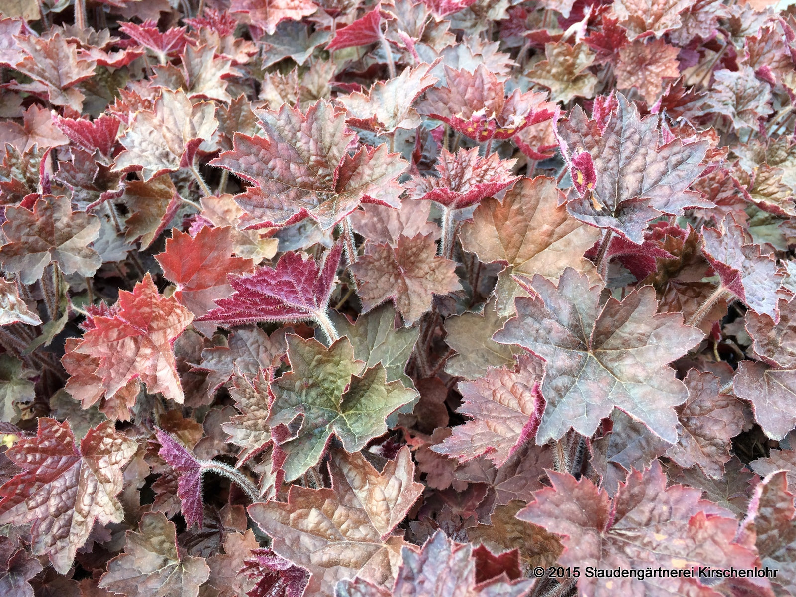 Cremeweiße Blütchen an aufrechten Rispen. Braunrotes Laub mit glänzender Blattoberseite. Wintergrün. Aus generativer Vermehrung!