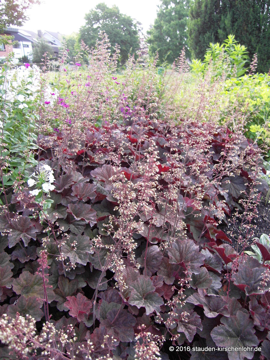Cremeweiße Blüten an langen Rispen. Auffällige Züchtung mit wintergrünem, tief braunrotem Laub. Tolerante H. villosa Hybride.