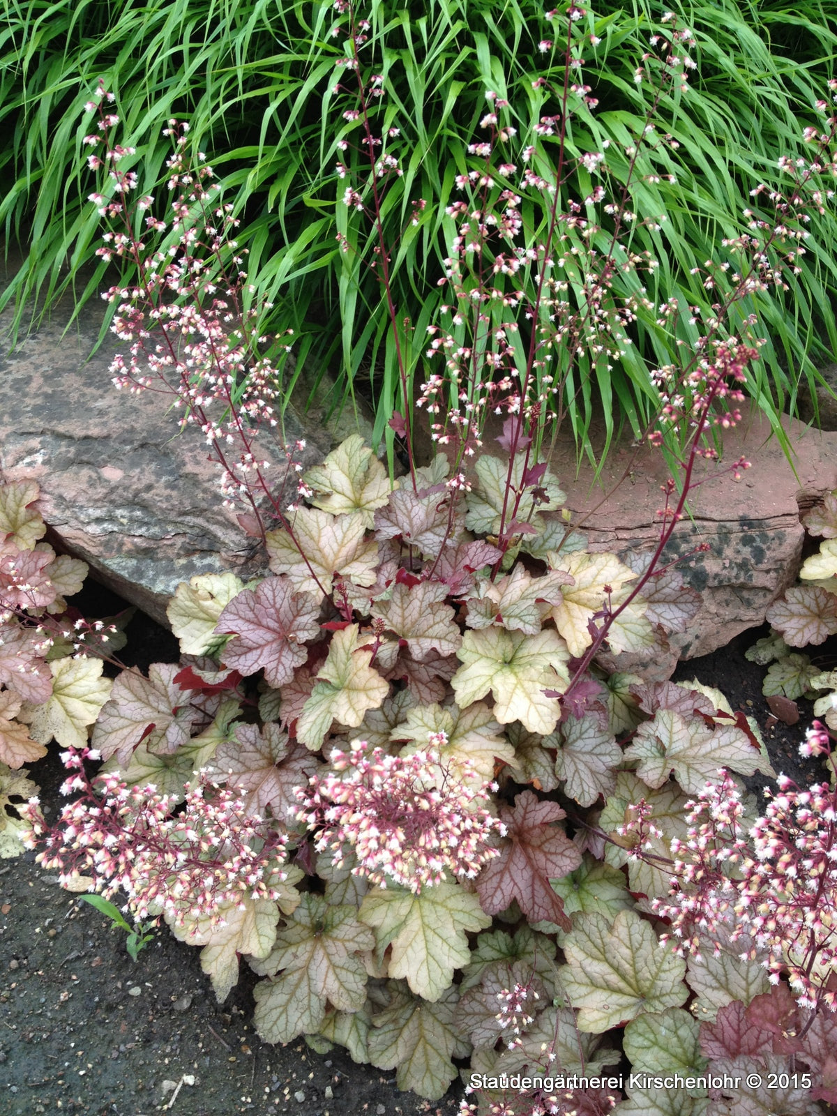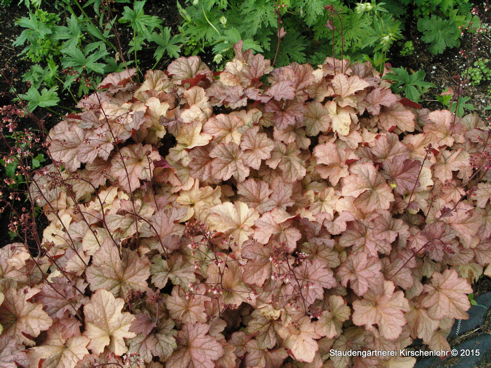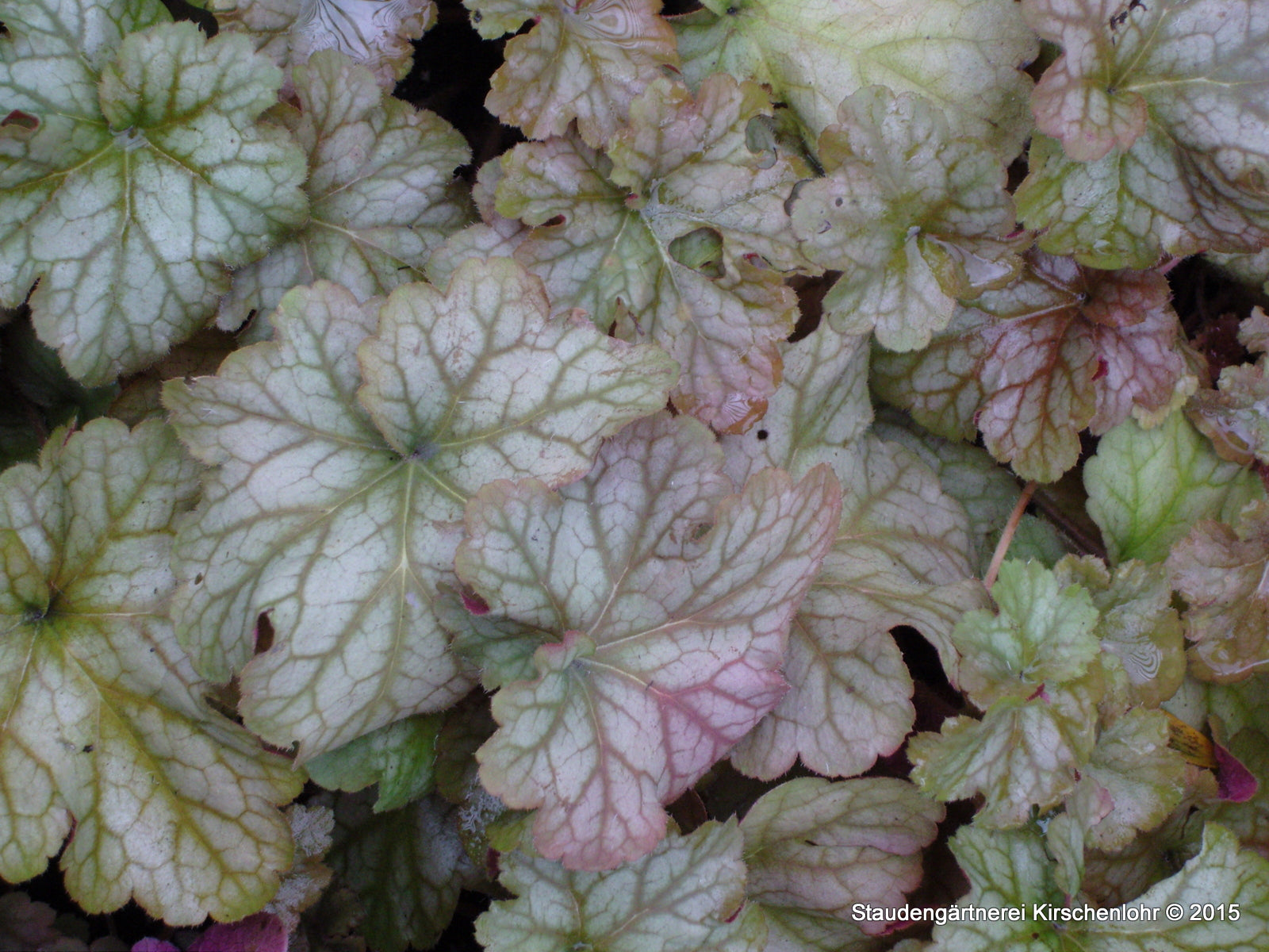 Cremeweiße Blütenrispen. Blattfärbung zwischen bernsteinfarben und altrose im Grundton. Nicht zuletzt rundet eine silberne Blattzeichnung das ganze ab.