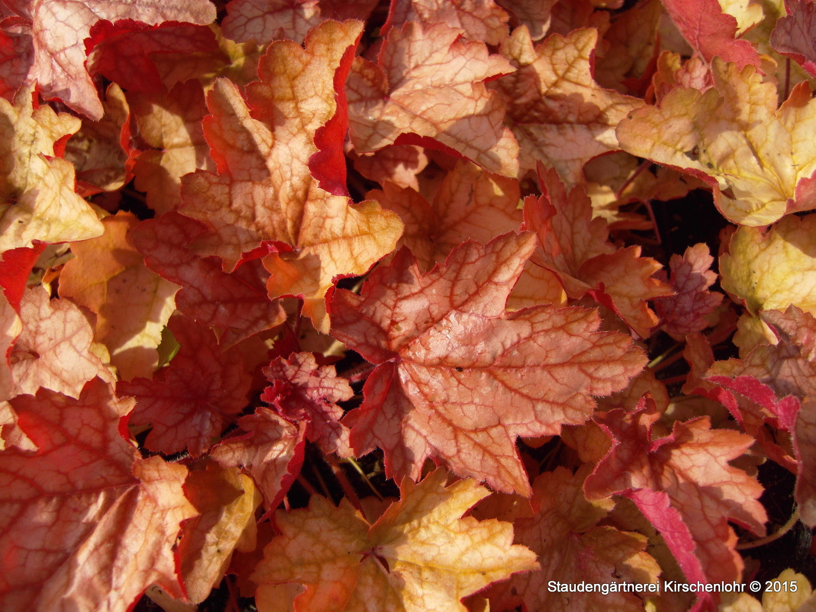 Cremeweiße Blütenrispen. Intensiv pfirsich- bis orangerote, leuchtende Blätter. Sehr auffällig. Kompakter dichter Wuchs. Wintergrün.