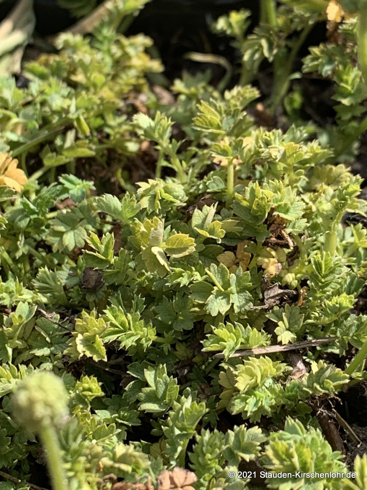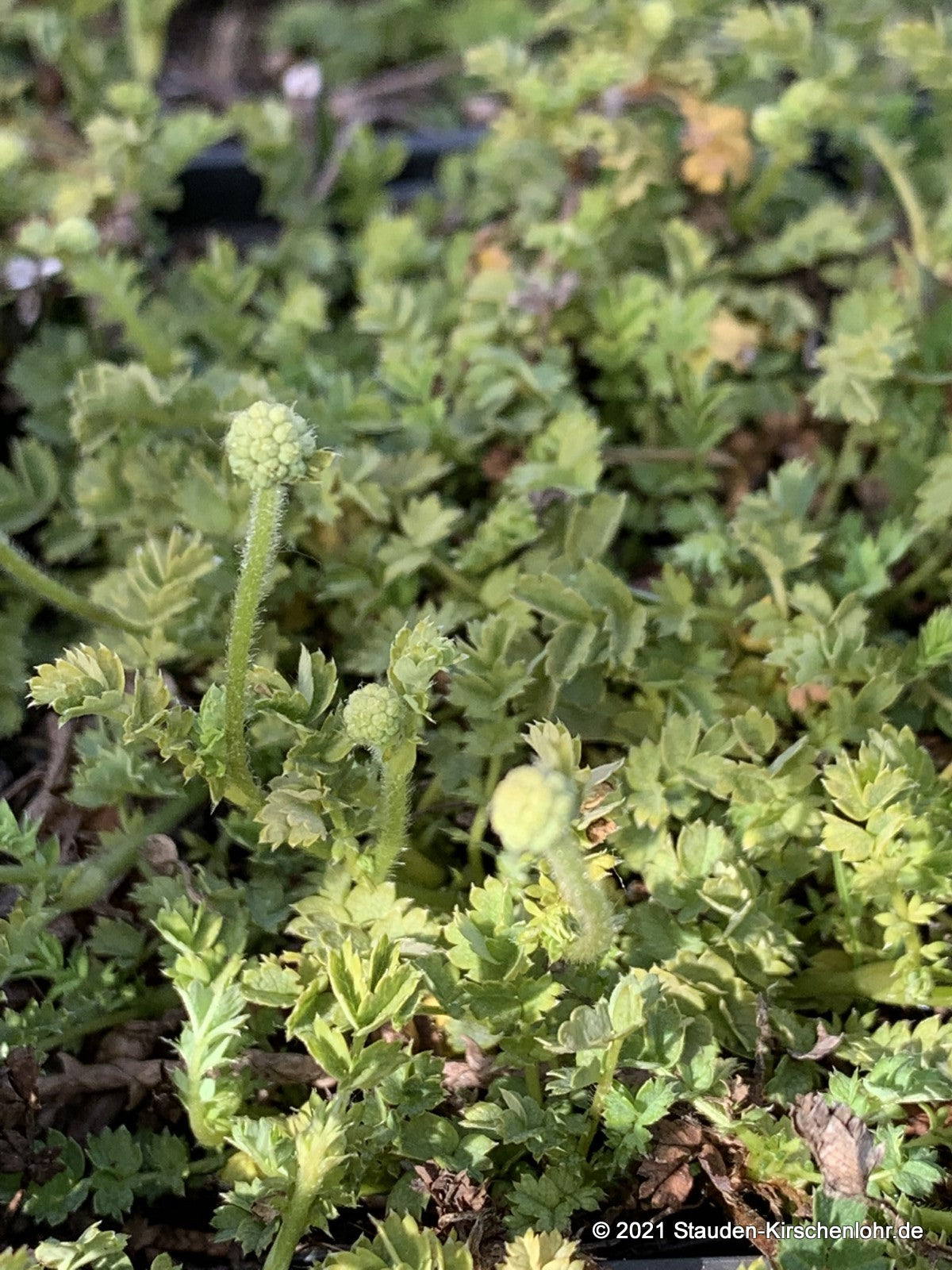 Polsterbildender Bodendecker mit eher unscheinbarer, weißer Blüte. Kugelige braungrüne Fruchtstände. Gefiedertes graugrüne Blätter und Stängel. Immergün.