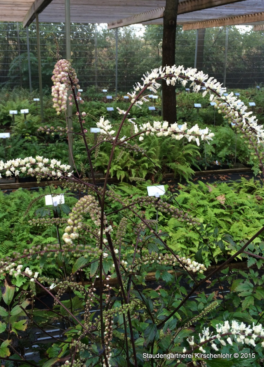 Bogig überhängende, Cremeweiße Blütentrauben mit zartgelbem Schimmer. Die Knospen sind rosagetönt. Gefiedertes, glänzendes, schwarz-rotes Laub. Im Herbst deutlich weniger ausgeprägte Färbung der Blätter. Sommergrün! syn. Cimicifuga (C. simplex x C. racemosa)
