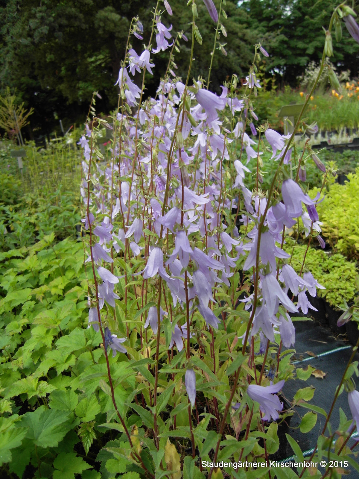 Helle, violettblaue, nickende Glocken mit leichtem rosa Schimmer. Selektion von Jan Spruyt (B). Üppig blühend. (syn. Campanula sarmatica 'Hemelstraling').