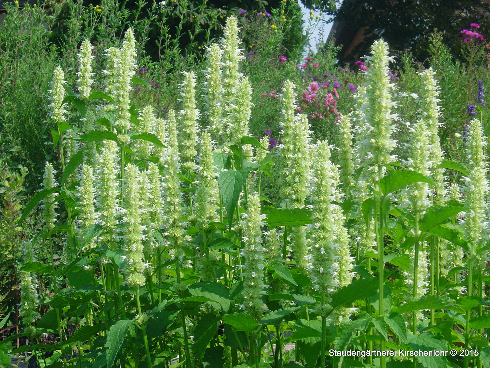 Grünlich-weiß wirkende Blütenähren. Herzförmige, lanzettliche Blätter mit gesägtem Blattrand. Minze-Anis-Aroma. Toleriert keine Winterstaunässe.