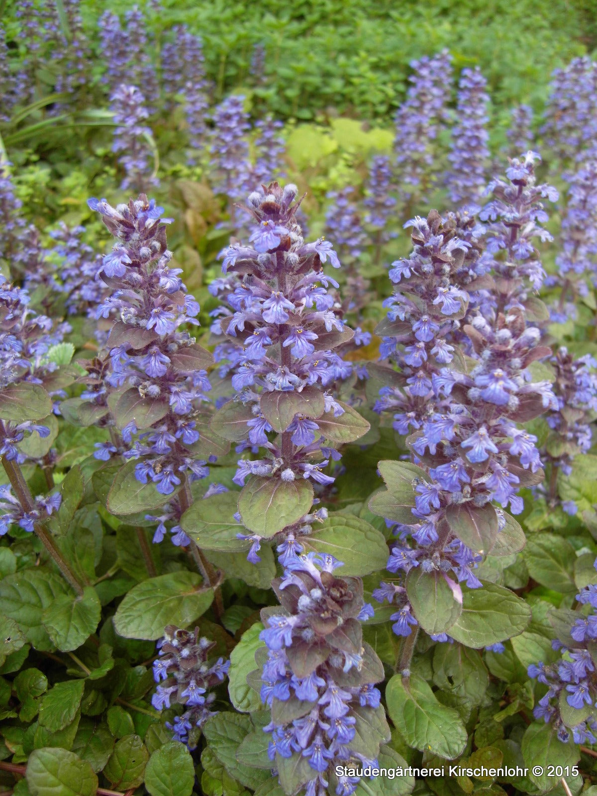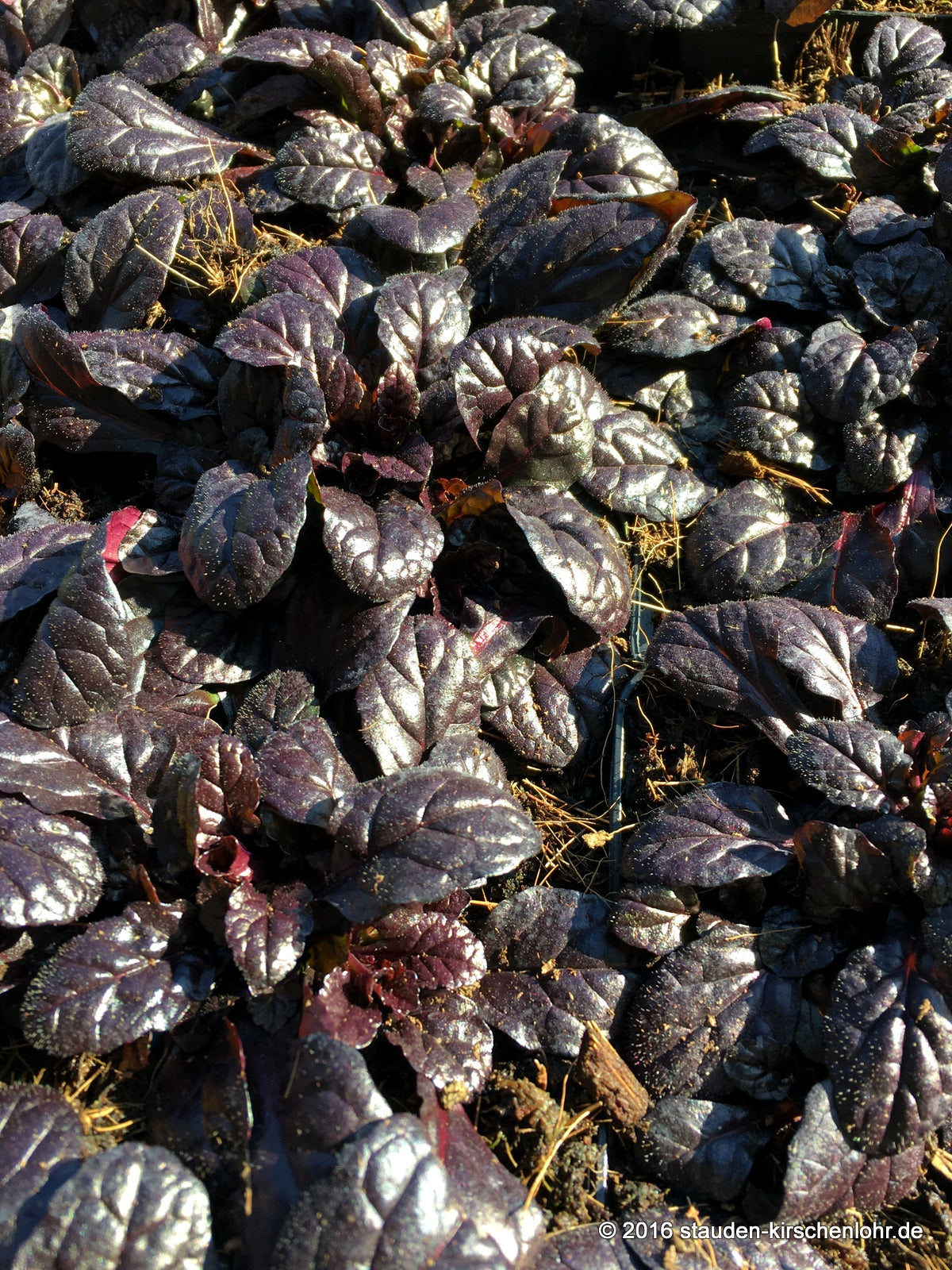 Violettblaue Blütenkerzen. Mattes, braunrotes, spatelförmiges Laub. Anspruchsloser und dicht schließender Bodendecker. Wintergrün. syn. A. r. 'Braunherz'