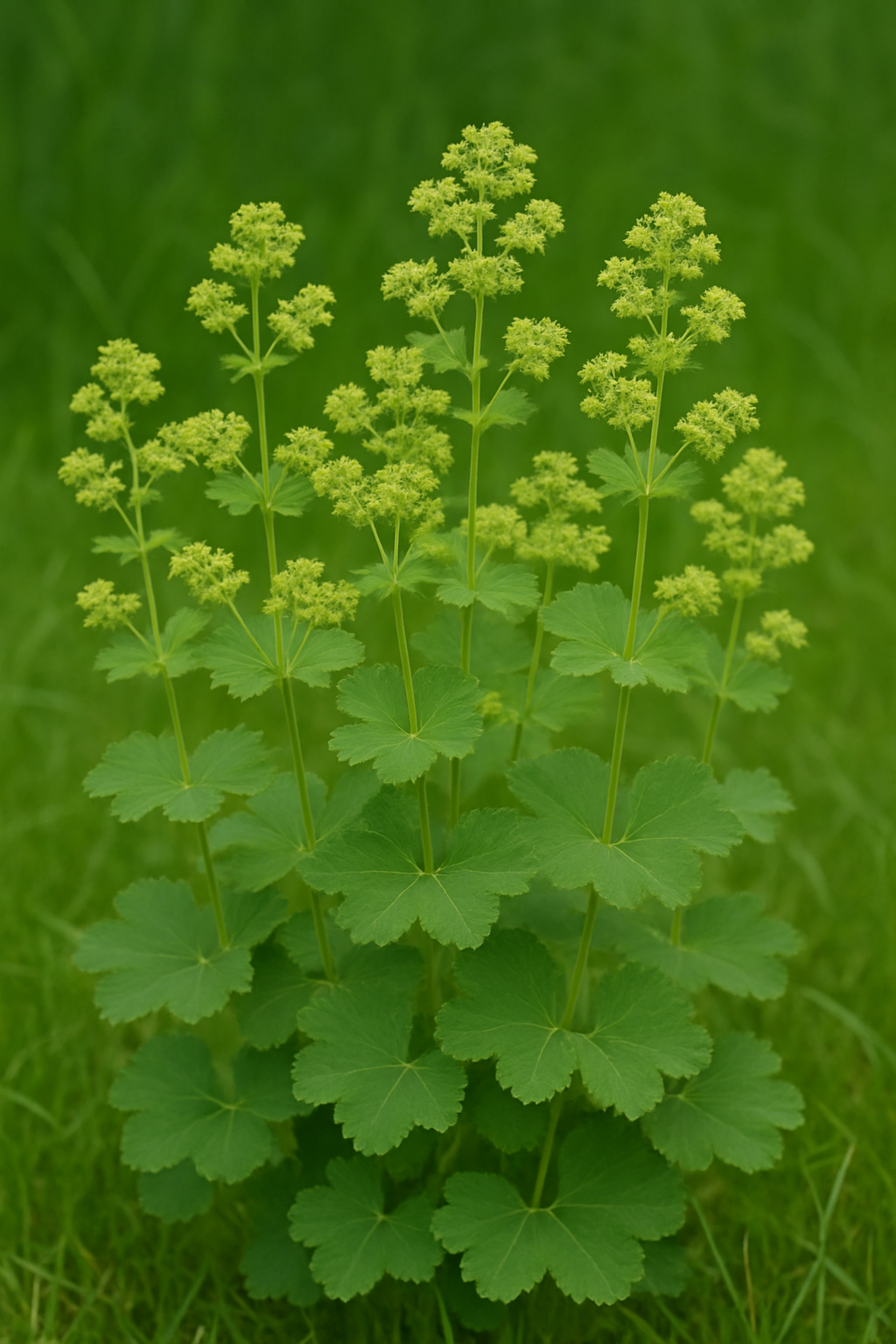Hellockergelben Blütenrispen. Die Blattoberseiten sind kahl, die Unterseiten behaart. Heimische Wiesenpflanze, welche auch als raditionelle Heilpflanze beliebt ist. syn. Alchemilla vulgaris subsp. xanthochlora