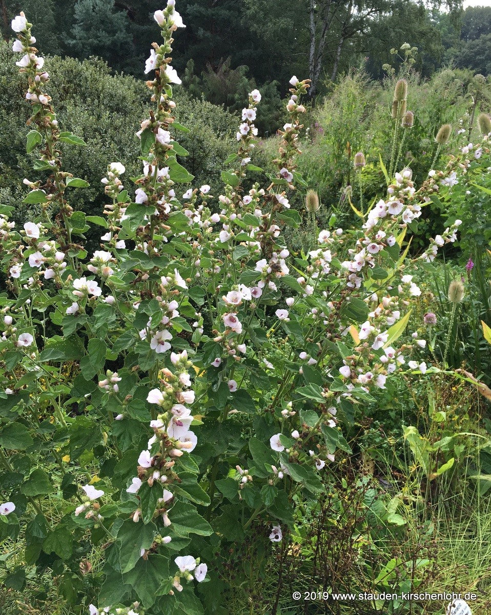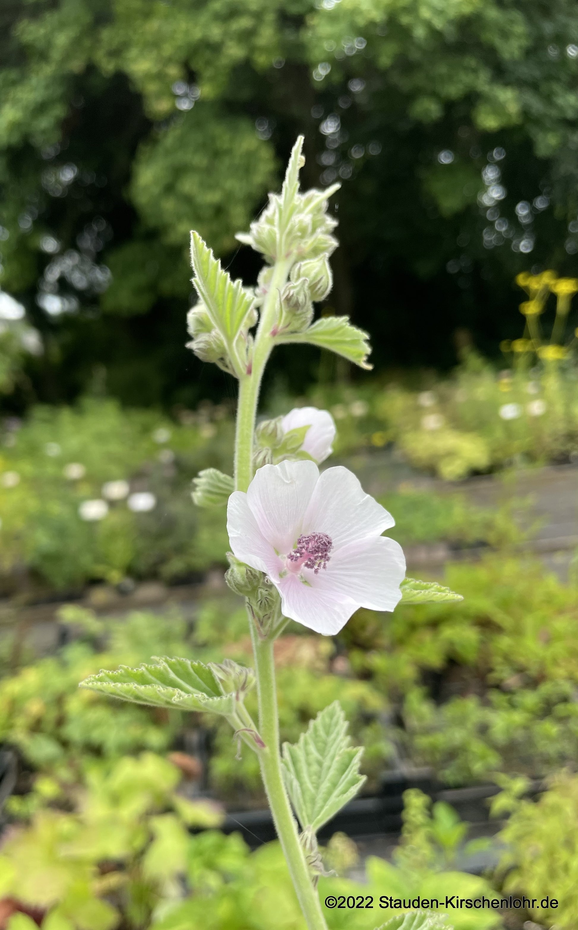 Diese Solitästaude blüht in hellstem lilarosa. Graugrüne Blätter, weich behaart, leicht dreilappig. Blattrand grob gesägt. Sehr wirkungsvoll und imposant.