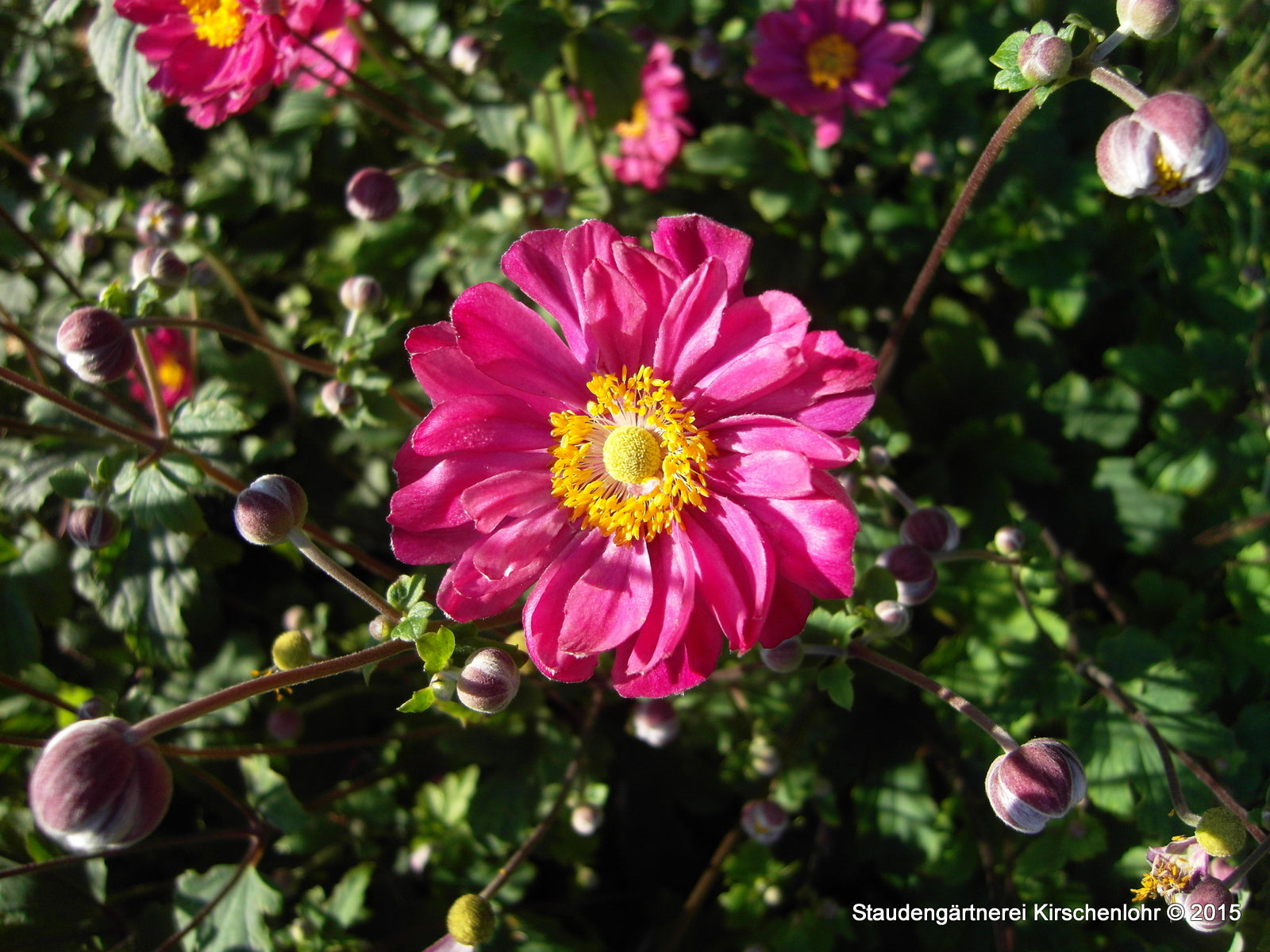Halbgefüllte Sorte mit purpurrosa, schalenförmigen Blüten. Diese sitzen an über dem Laubbusch stehenden Stielen. Kompakter Wuchs.