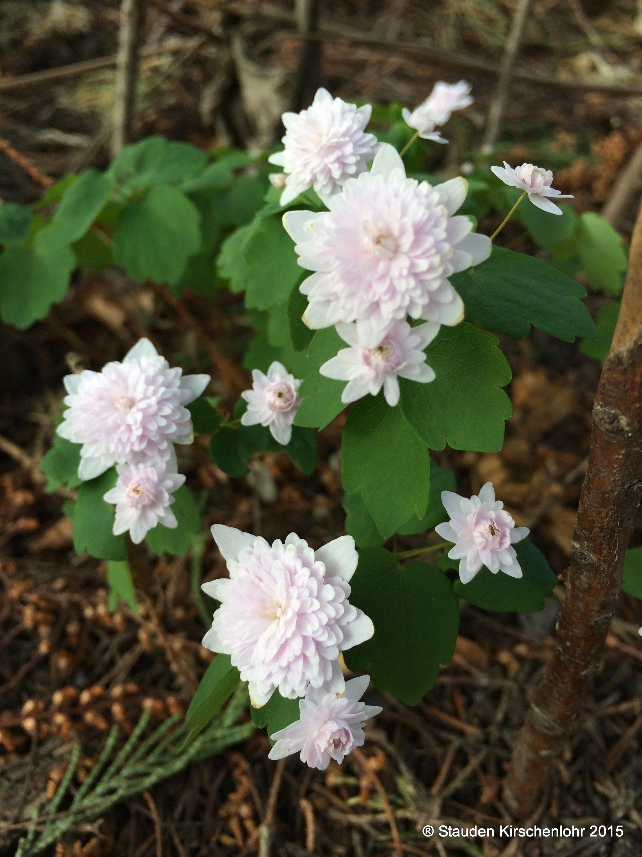 Gefüllte, rosenquarzfarbene Blüten. Liebliche, Schattenstaude aus Nordamerika. Bevorzugt humose Böden. Langsam wachsend, aber sehr langlebig.