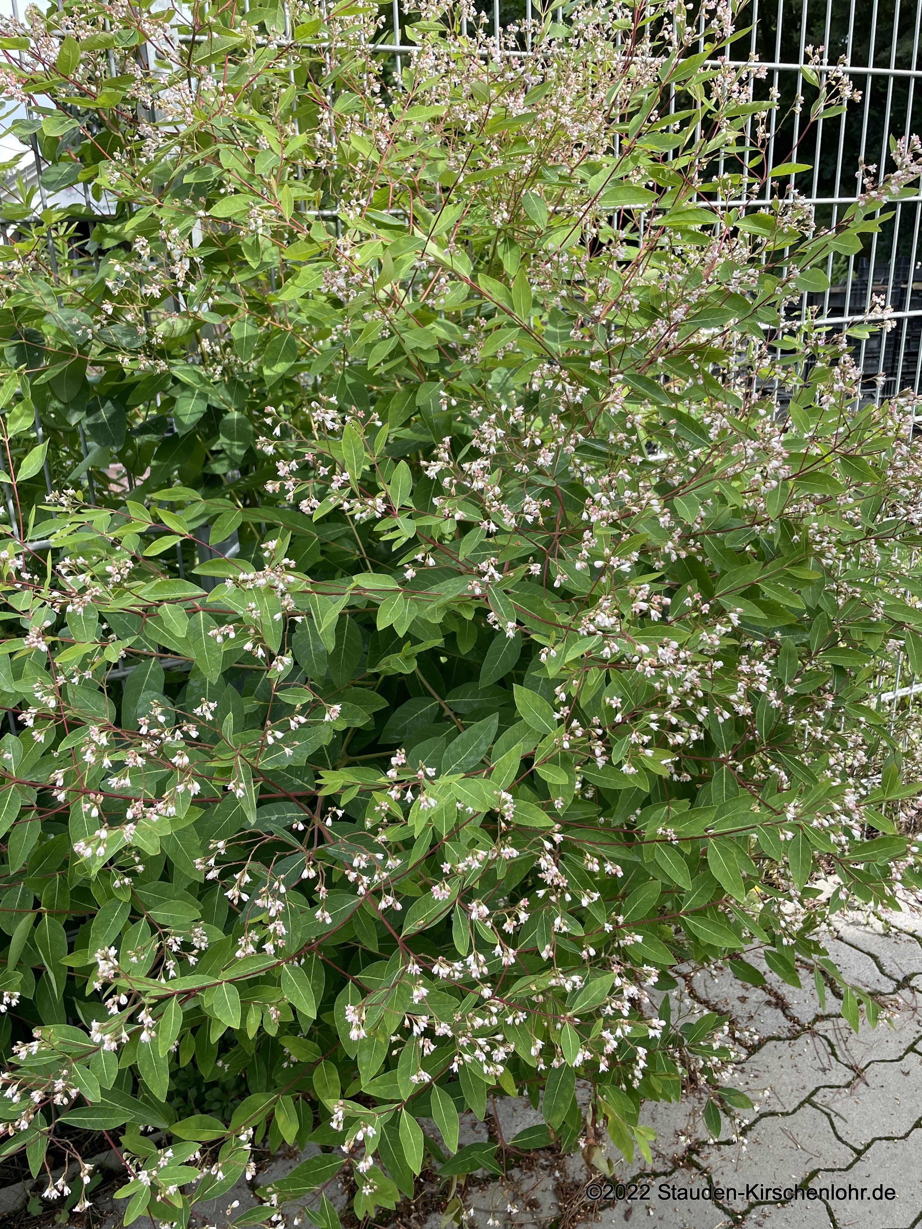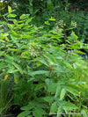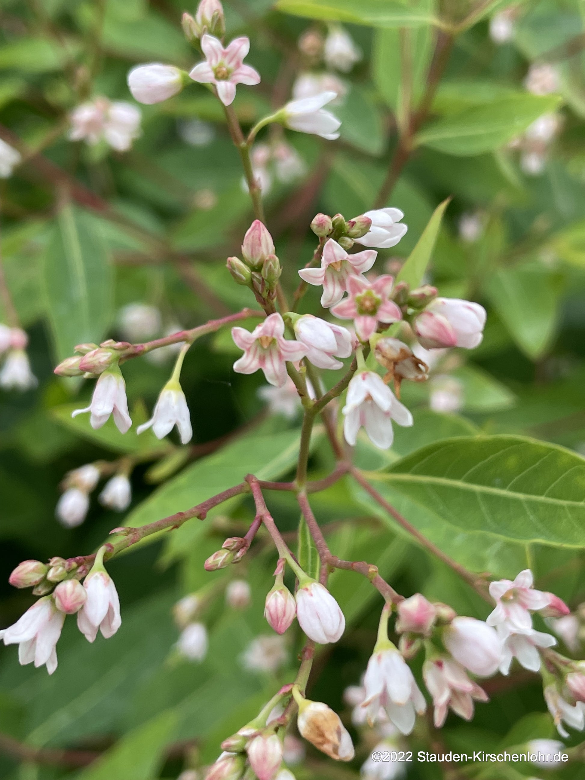 Blütenrispe mit kleinen rosa, glockenförmigen, leicht nickenden Blütchen. Ovale, sattgrüne Blätter. Stängel und Blätter enthalten Milchsaft. Sommergrün. syn. Cynopaema androsaemifolium