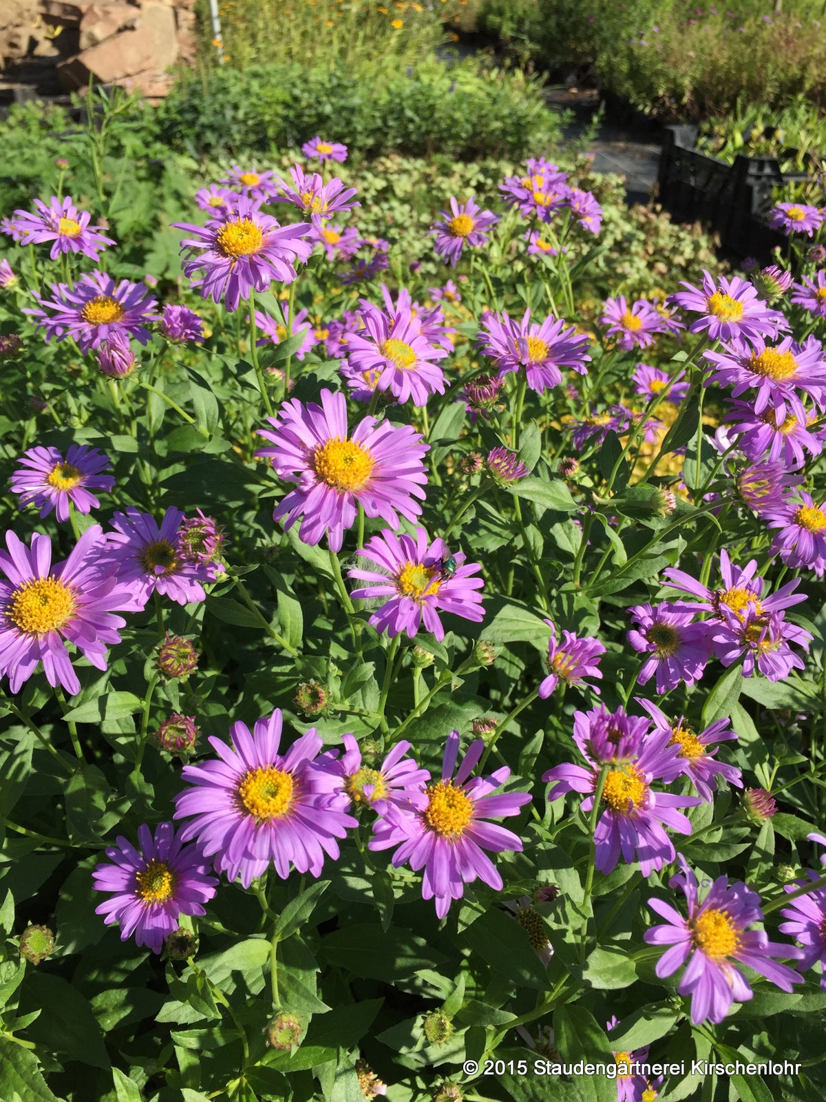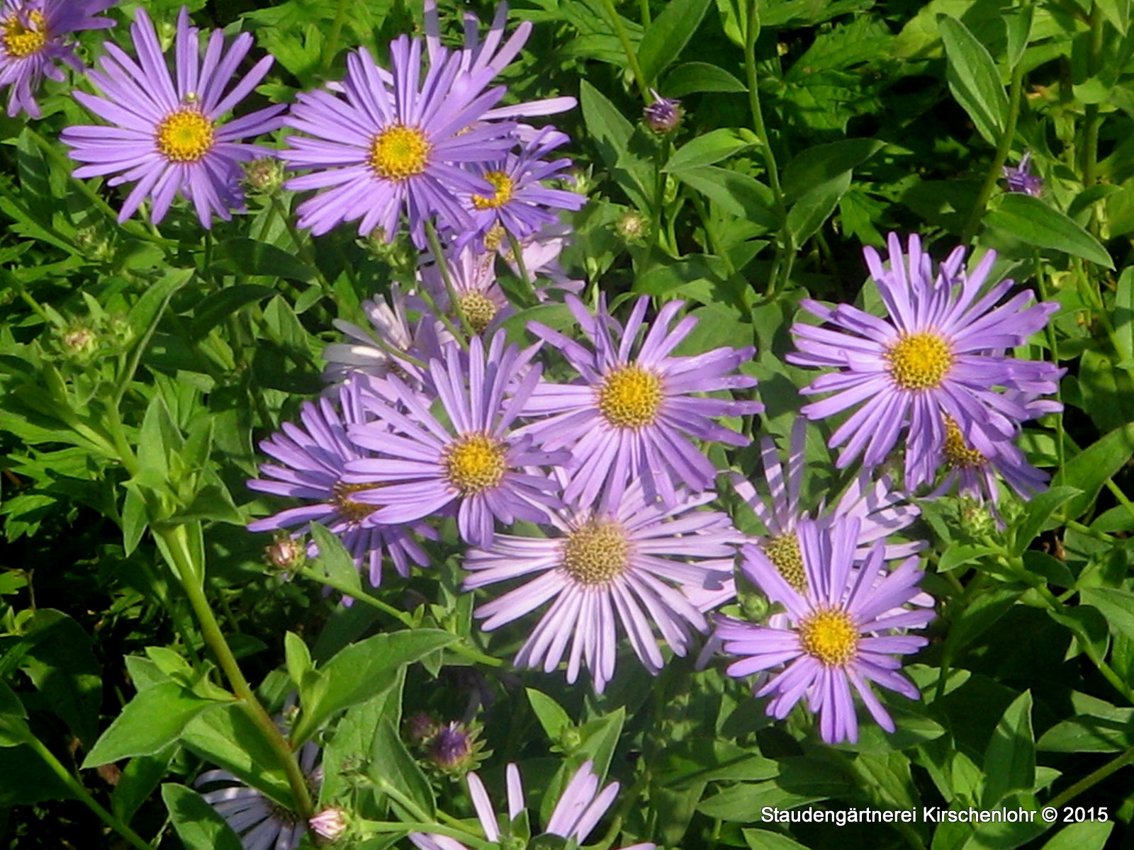 Hell violettblaue Blütenblätter. Robuste, reichblühende Kreuzung. Sehr schöne kompakte Sorte für kleinere Beete. Sommergün. (A. amellus × A. thomsonii)
