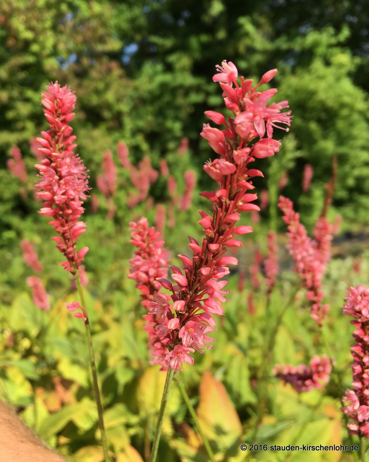 Kräftige, leuchtend lachsrosa Einzelblüten an dichten, aufrechten Scheinähren. Breitlanzezttliche, zugespitzte Blätter. Sommergün.
