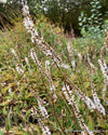 Der grazile Blütenstand elfenbeinweiße Scheinähren. Die hellen Blüten auf dunklen Stielen sind mehrfach verzweigt und stehen in gutem Kontrast zum Laub. Von Chris Gyselen (B).